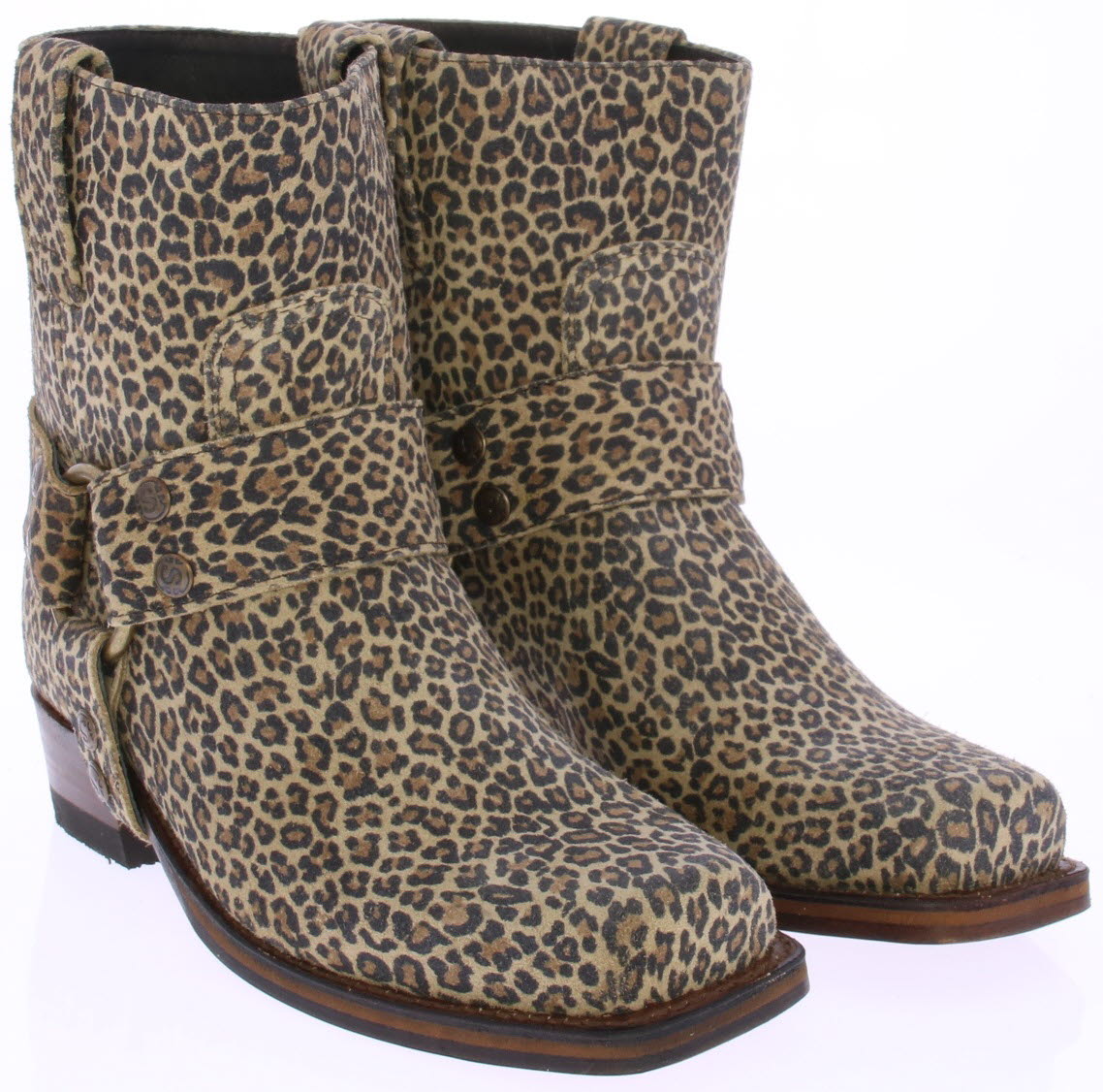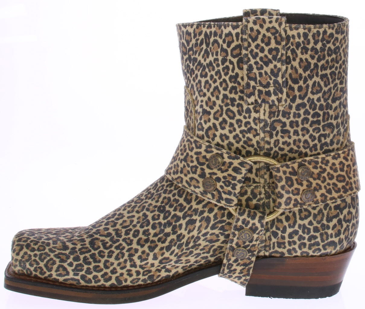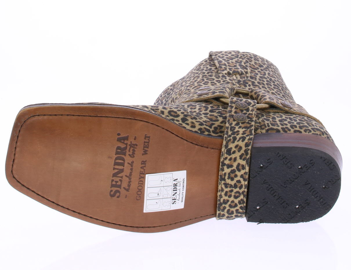 Leopard print suede women's ankle boot by SENDRA. This edgy boot features a blunt square toe. The sole is made of leather. The included spur around the boot can be removed and optionally exchanged for an embellished spur. A matching belt is also available.