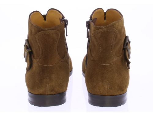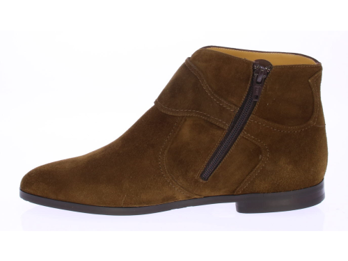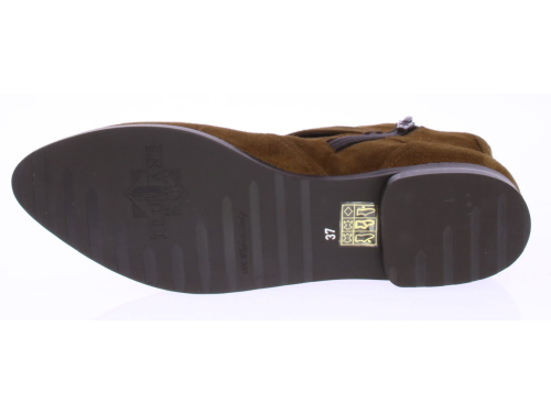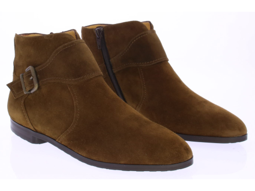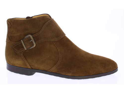 Brown suede women's ankle boot by Trumans's. The boot features a very comfortable footbed with cushioning in the insole and a very supple construction. The brown shade is warm in color. The shoe has a zipper on the inside and a flap with a buckle runs across the instep.