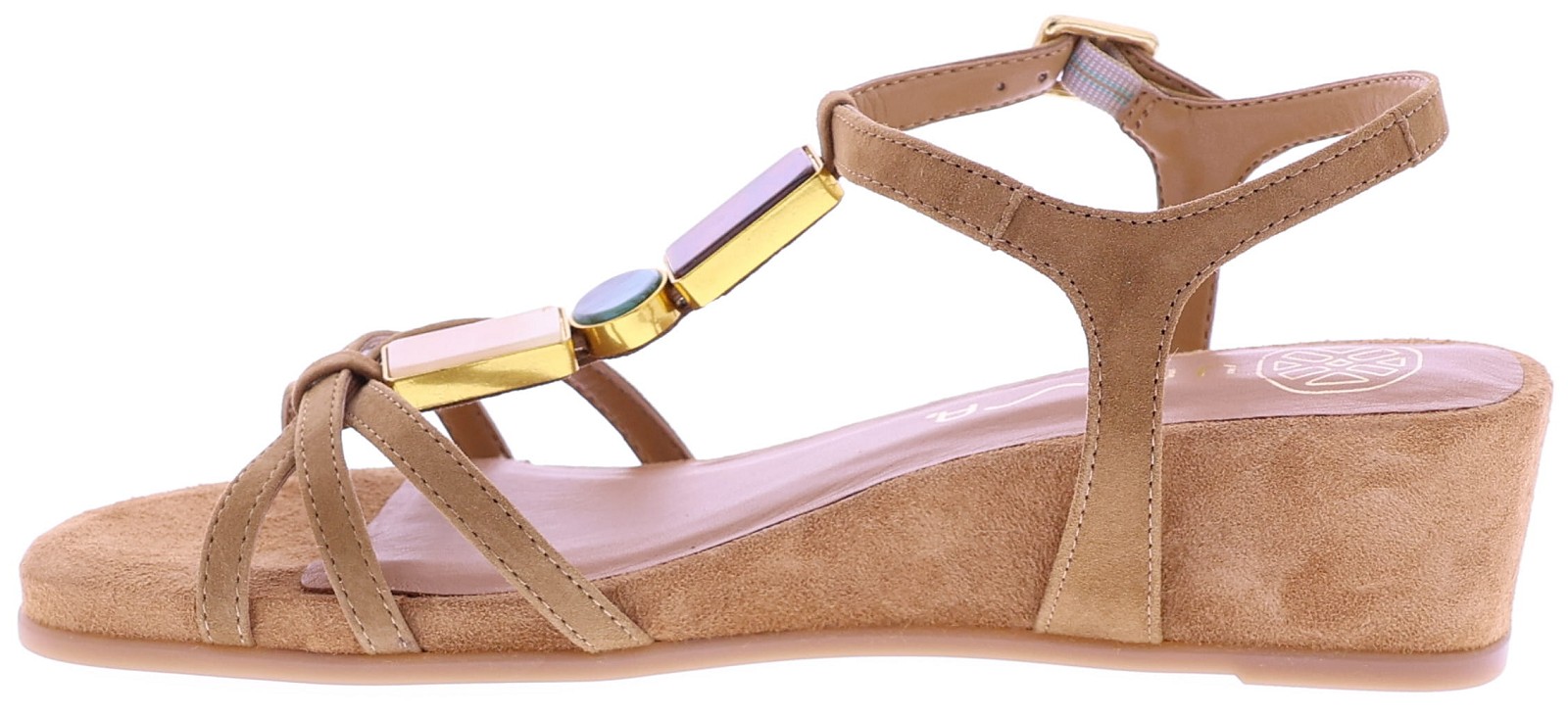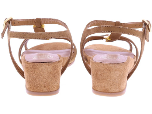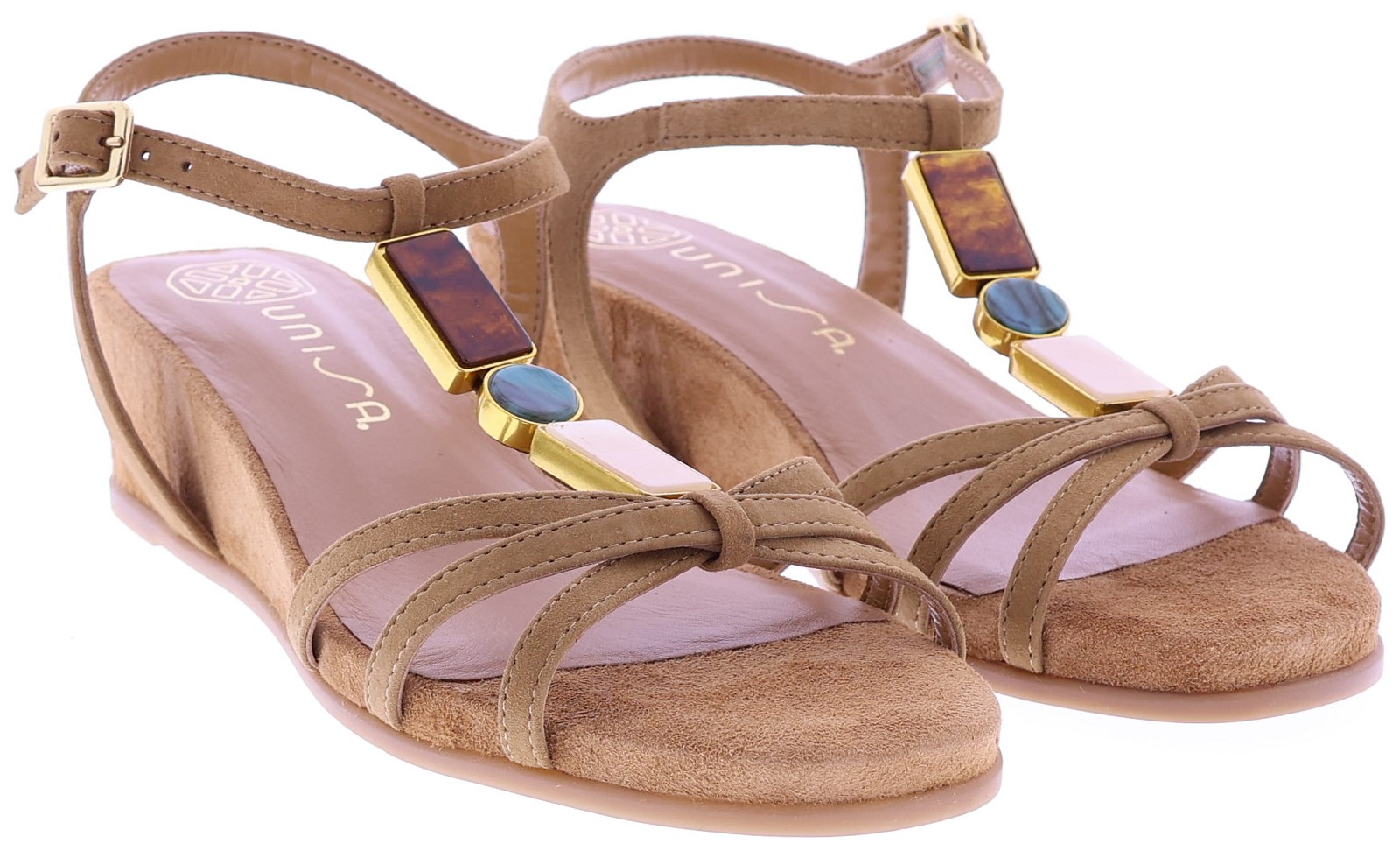 Medium brown suede women's sandals by Unisa, model Bedel. This sandal is crafted from soft suede and features narrow straps embellished with gemstones in warm tones. The adjustable buckle ensures a comfortable fit, while the comfortable 3cm wedge heel provides a subtle lift without compromising on wearing comfort. A stylish and summery choice that pairs perfectly with both an airy dress and casual linen trousers. Also discover other women's sandals from Unisa at Klijsen.