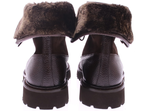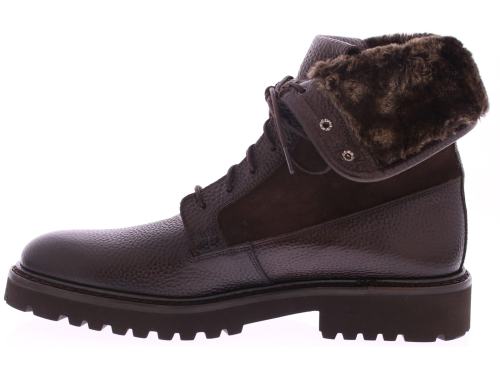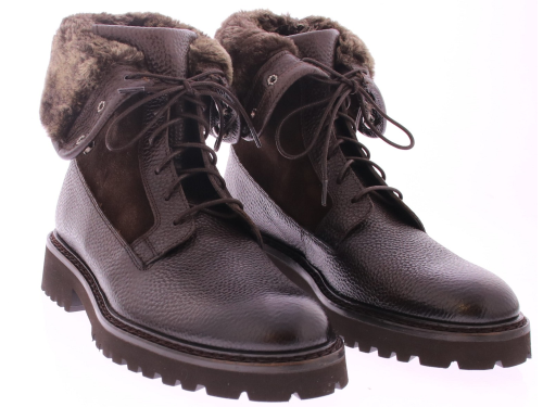 Men's fur lace-up boot in dark brown leather with a suede shaft. The shoe features a sportier rubber sole and is fully wool-lined. Hooks at the top of the laces make them easier to put on.