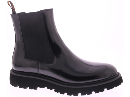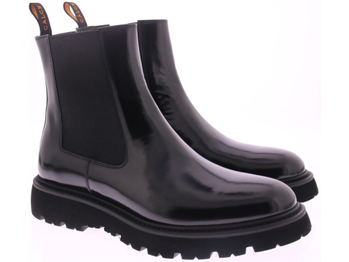 Men's Chelsea boots in black high-gloss leather from the Spanish brand Calce. The shoe features a sporty, lightweight rubber sole with a tread pattern. The lining is leather. Thanks to its design, the shoe can be worn both casually and more formally.