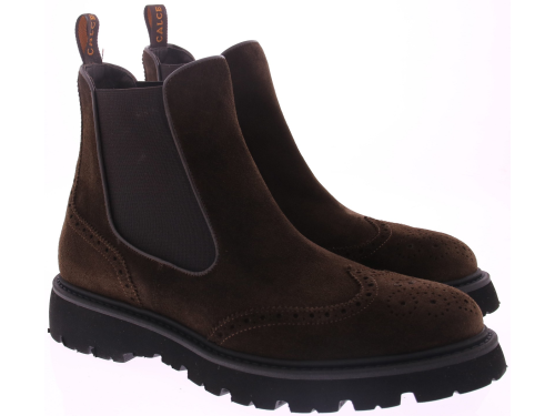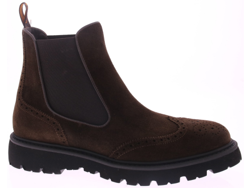 Men's Chelsea boots in dark brown suede from the Spanish brand Calce. The shoe features a wingtip and brogue-patterned heel, a leather lining, and a sporty, lightweight rubber sole.