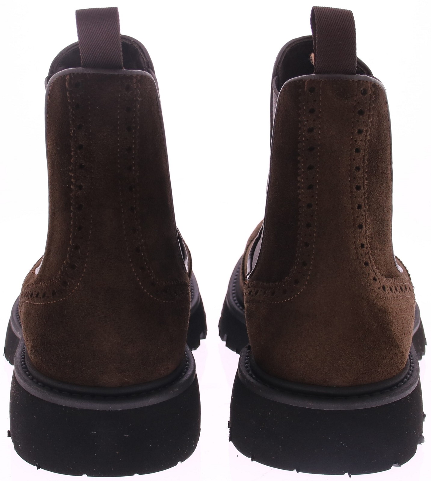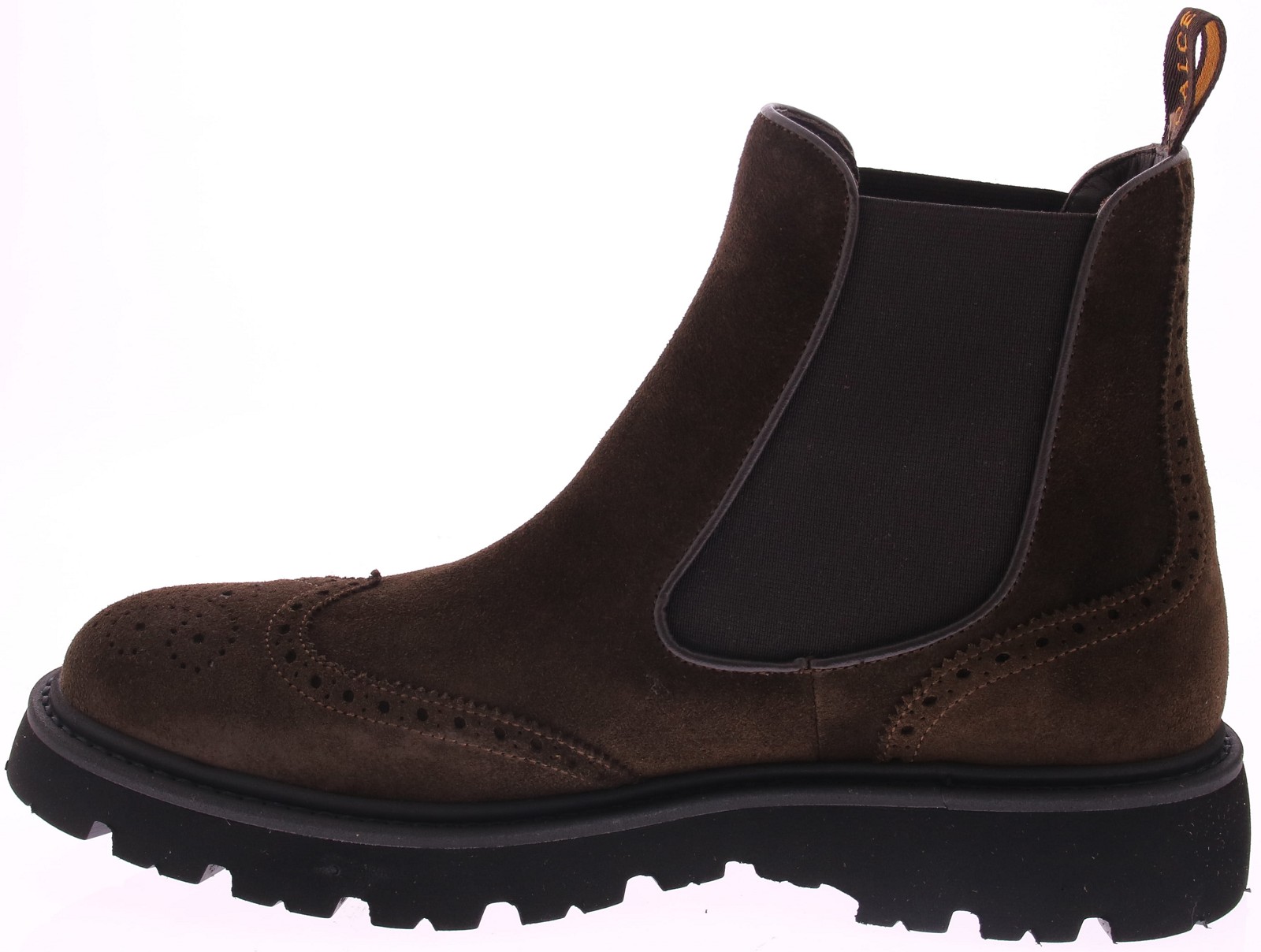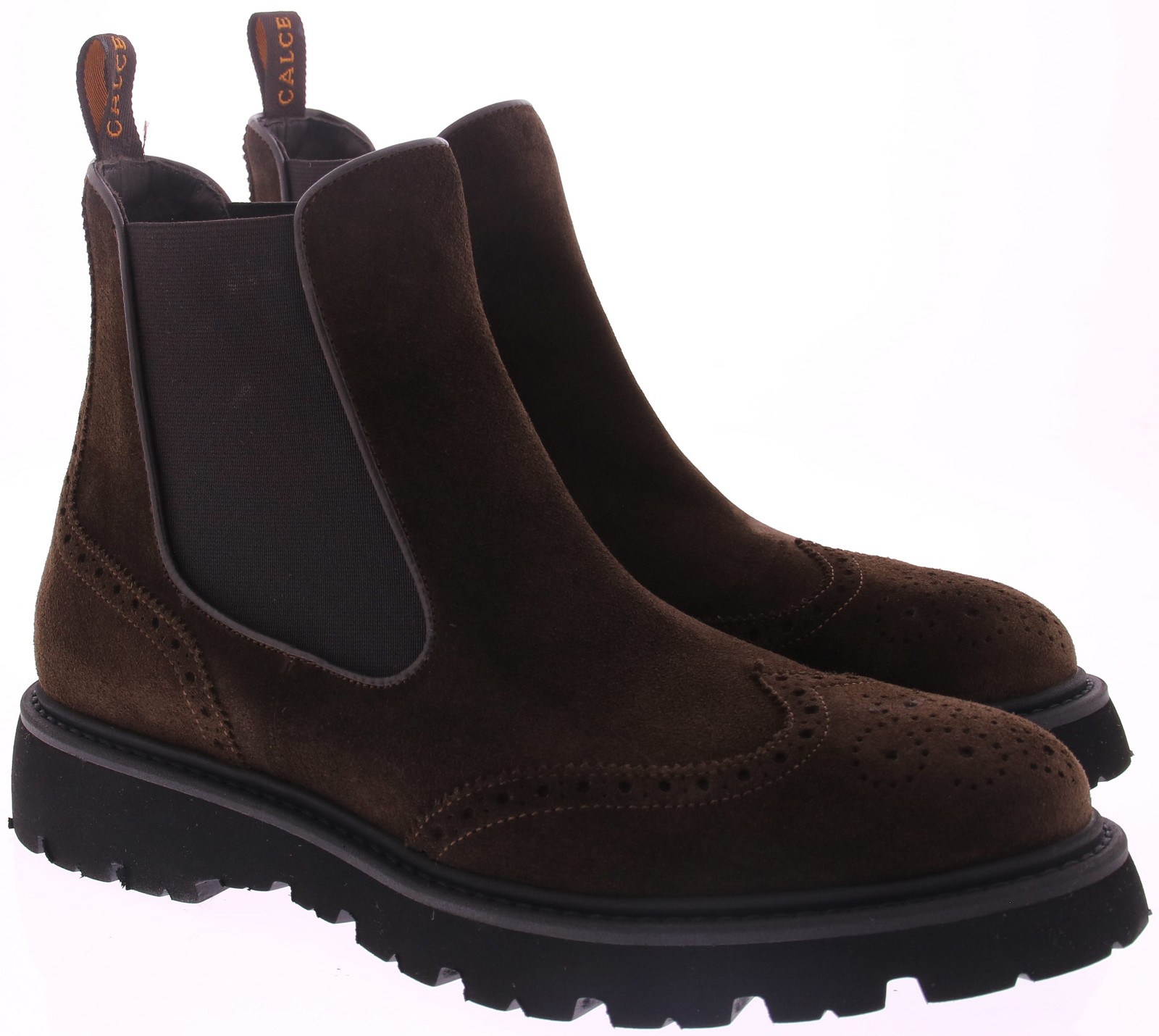 Men's Chelsea boots in dark brown suede from the Spanish brand Calce. The shoe features a wingtip and brogue-patterned heel, a leather lining, and a sporty, lightweight rubber sole.