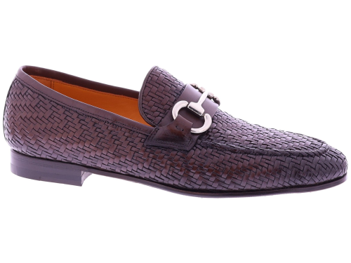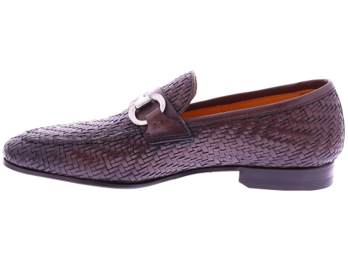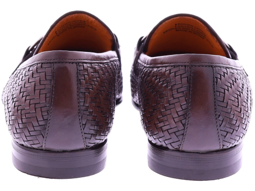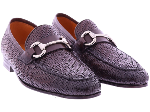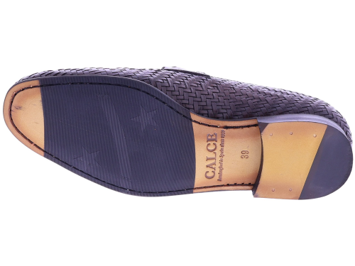Dark brown braided leather men's shoe from Calce. This elegant loafer is crafted from braided leather and features a subtle metal bit across the instep. The shoe has a leather lining and a leather sole with rubber on the wear surface for extra grip and durability. The refined finish and artisanal braiding give this shoe a timeless, Mediterranean allure.