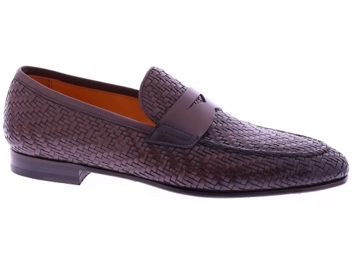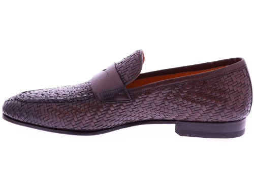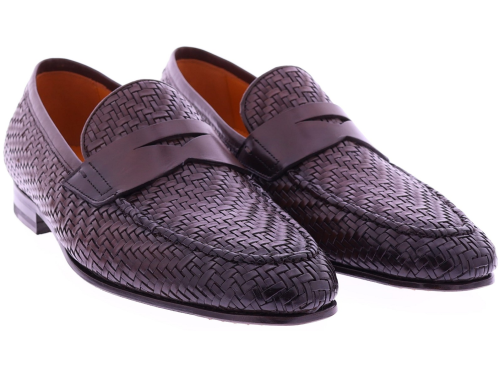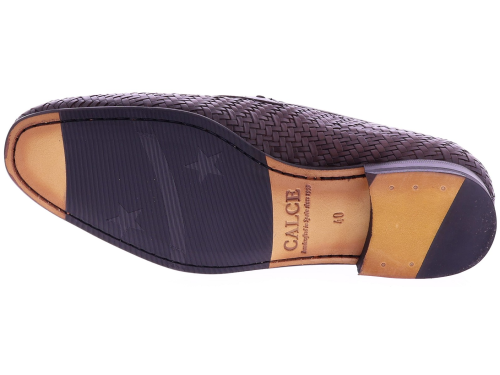 Dark brown braided leather men's shoe from Calce. This elegant loafer is crafted from braided leather and finished with a classic penny strap across the instep. The shoe has a leather lining and a leather sole with rubber on the wear surface, providing extra grip and durability. The handcrafted braiding and refined design give this loafer a stylish Mediterranean look.