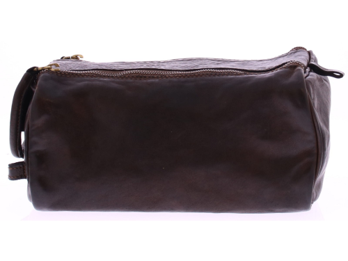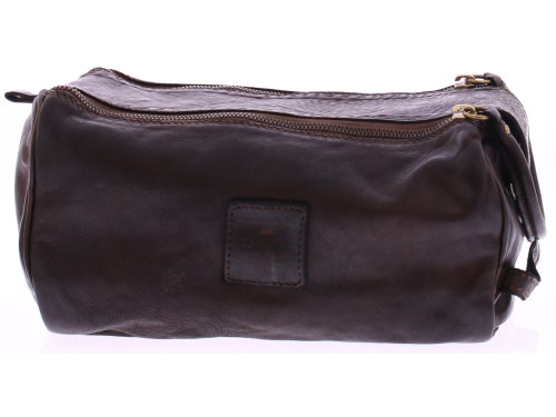 Dark brown tanned leather toiletry bag from Compamaggi. This stylish and practical toiletry bag from the Italian brand Campomaggi is made of naturally tanned dark brown leather with a unique vintage look. The bag closes with two zippers and a magnetic closure and has convenient handles. Inside, you'll find a spacious main compartment with four slip pockets – ideal for keeping your belongings organized. The used gold-tone details and the leather Campomaggi logo on the back complete the design. Dimensions: 24 x 15 x 11 cm