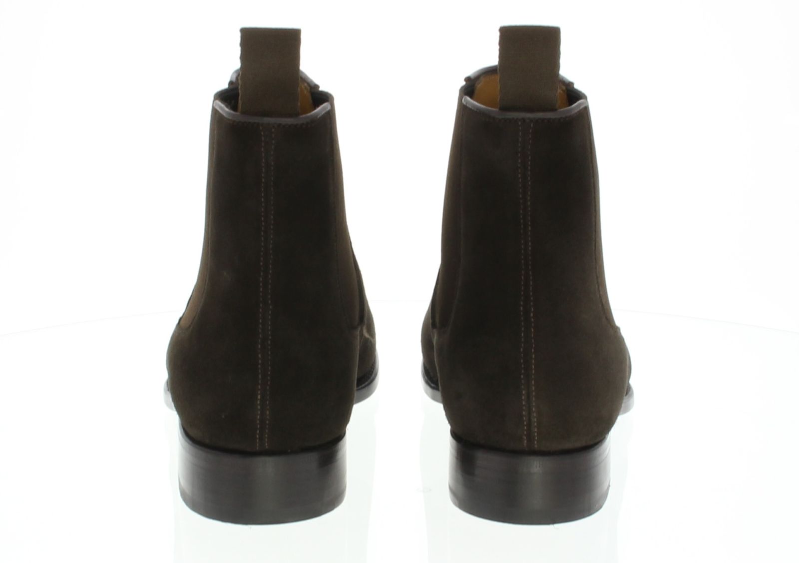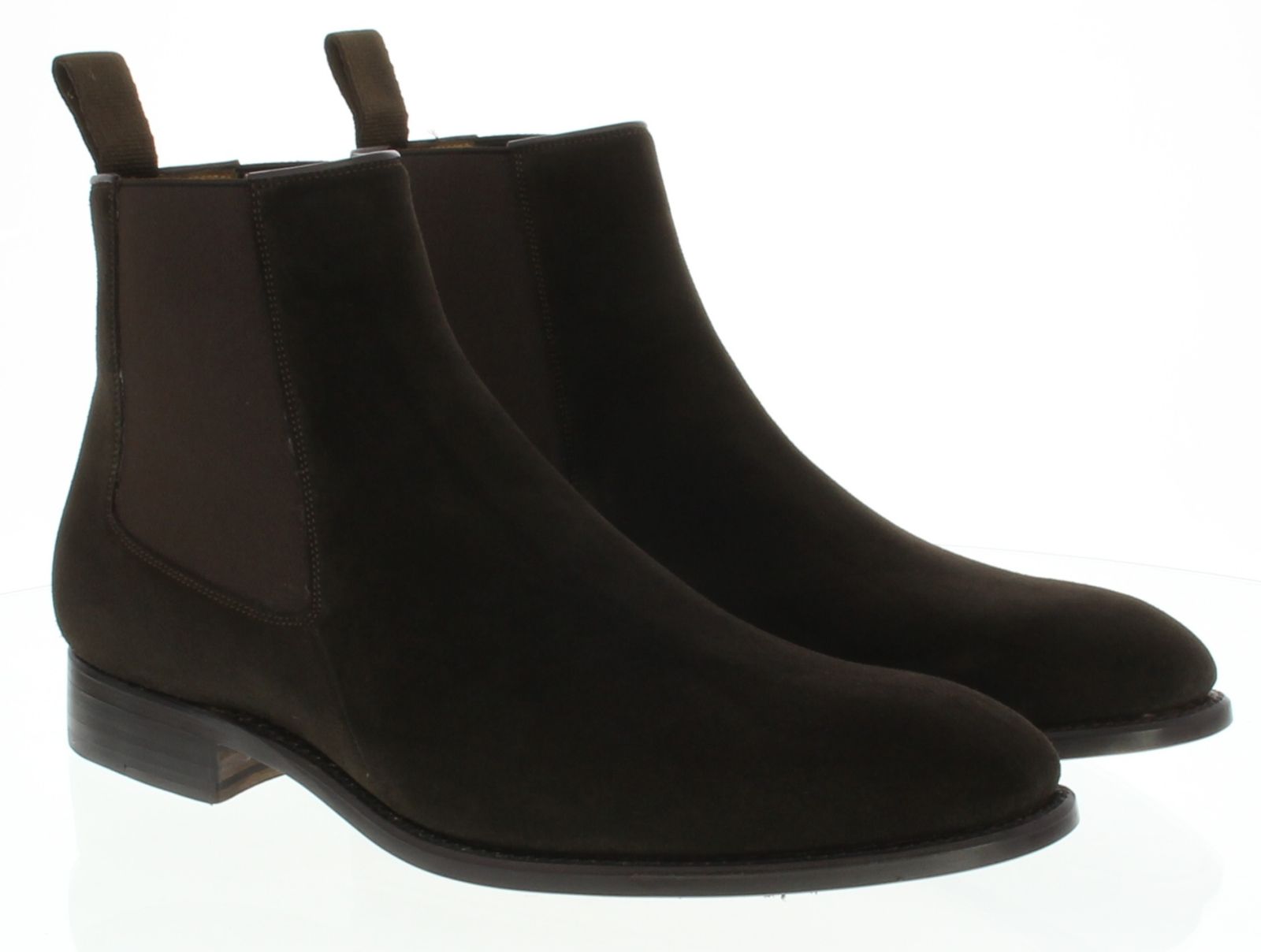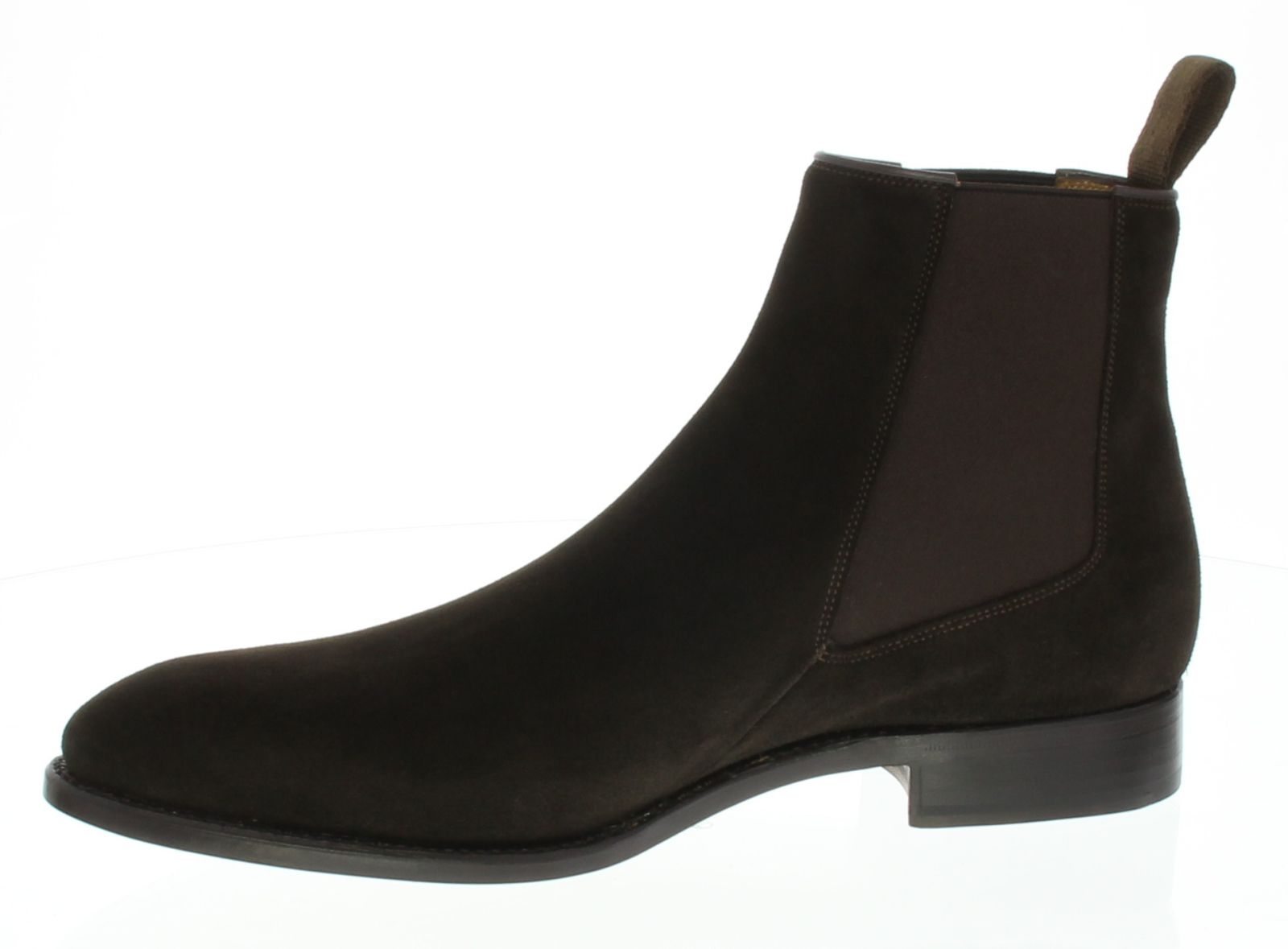 Dark brown suede men's Chelsea boot by Carlos Santos. The upper is made of calf suede. The lining and sole are made of leather and the shoe is made in the goodyear production method.