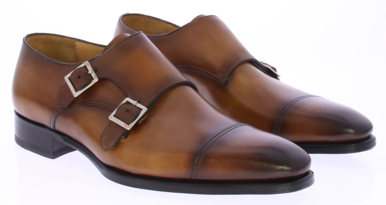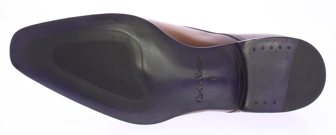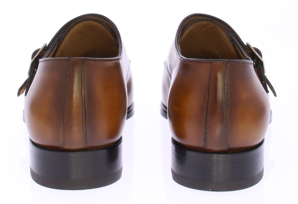 Cognac leather men's double buckle shoe by Carlos Santos. The shoe is made on the blake construction and has a calf leather upper which is finished by hand. The sole is made of leather with a rubber insert on the wear surface.