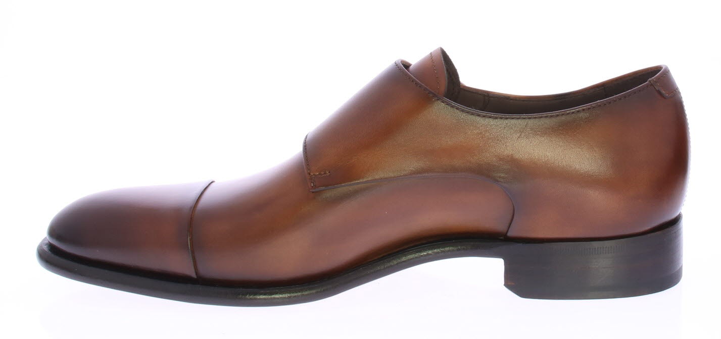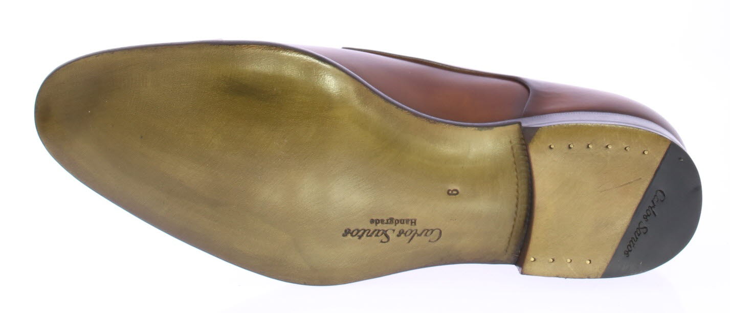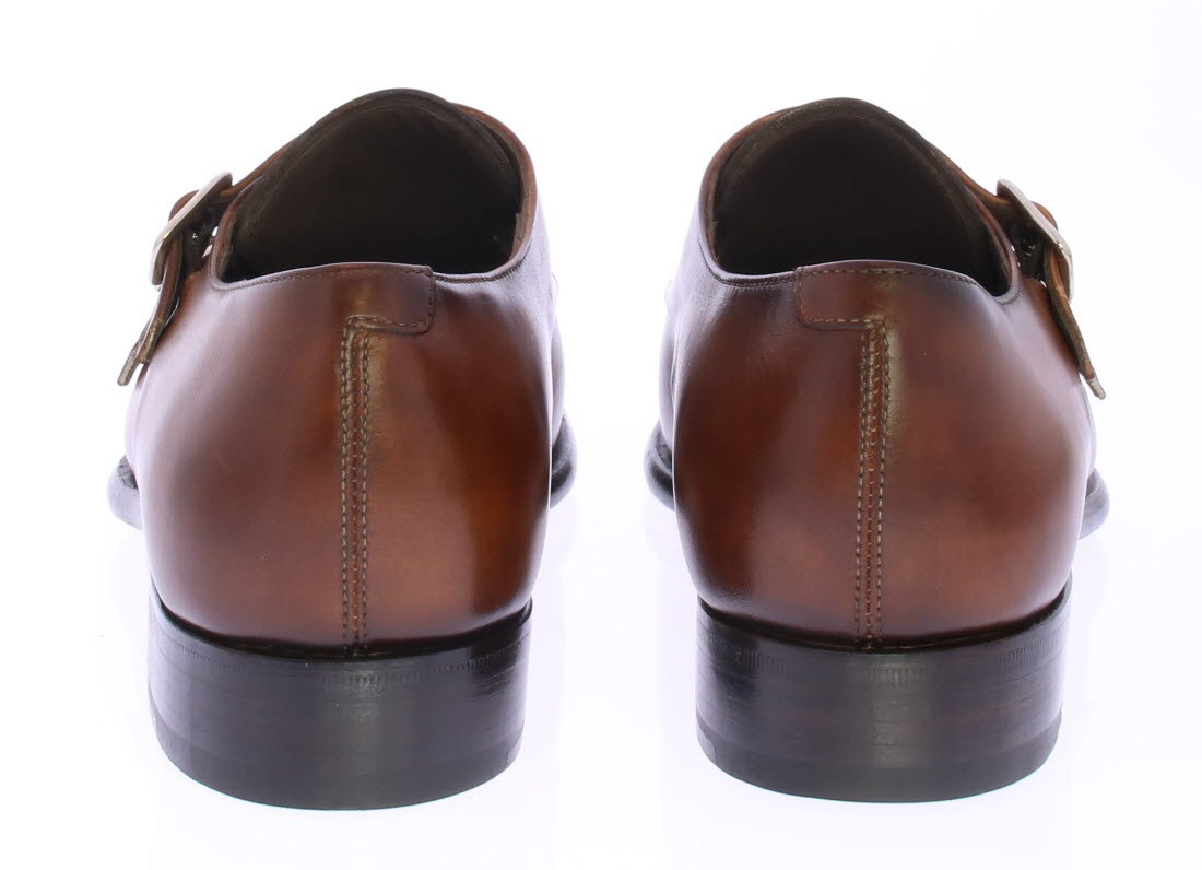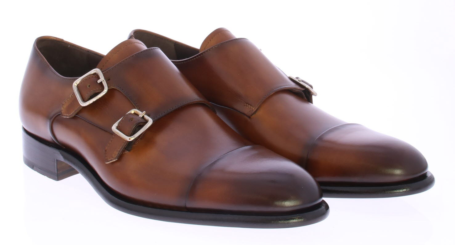 Mid brown leather double buckle shoe by Carlos Santos. The shoe has a toe seam and is luxuriously polished with a shadow hand finish from mid brown to darker brown.