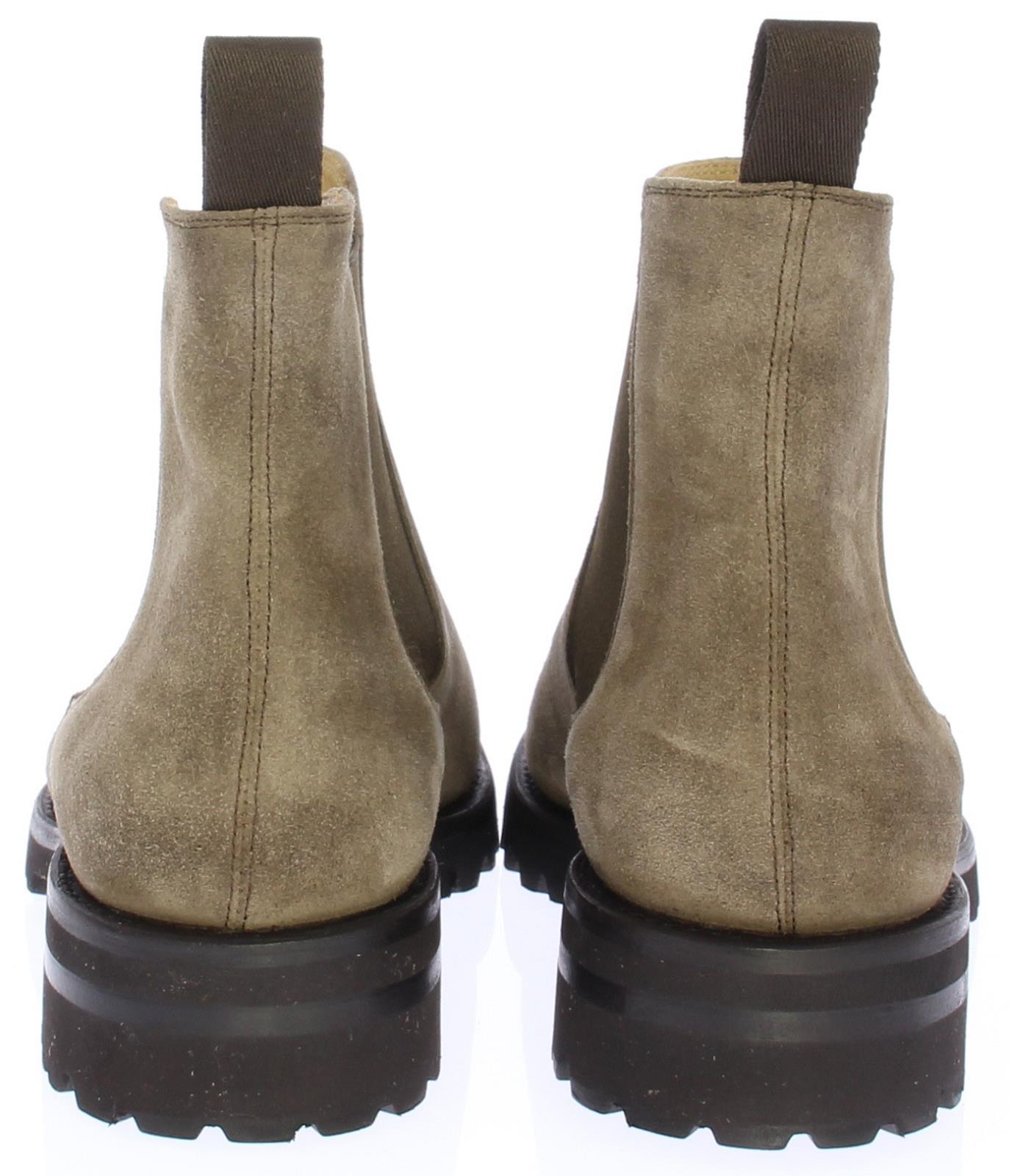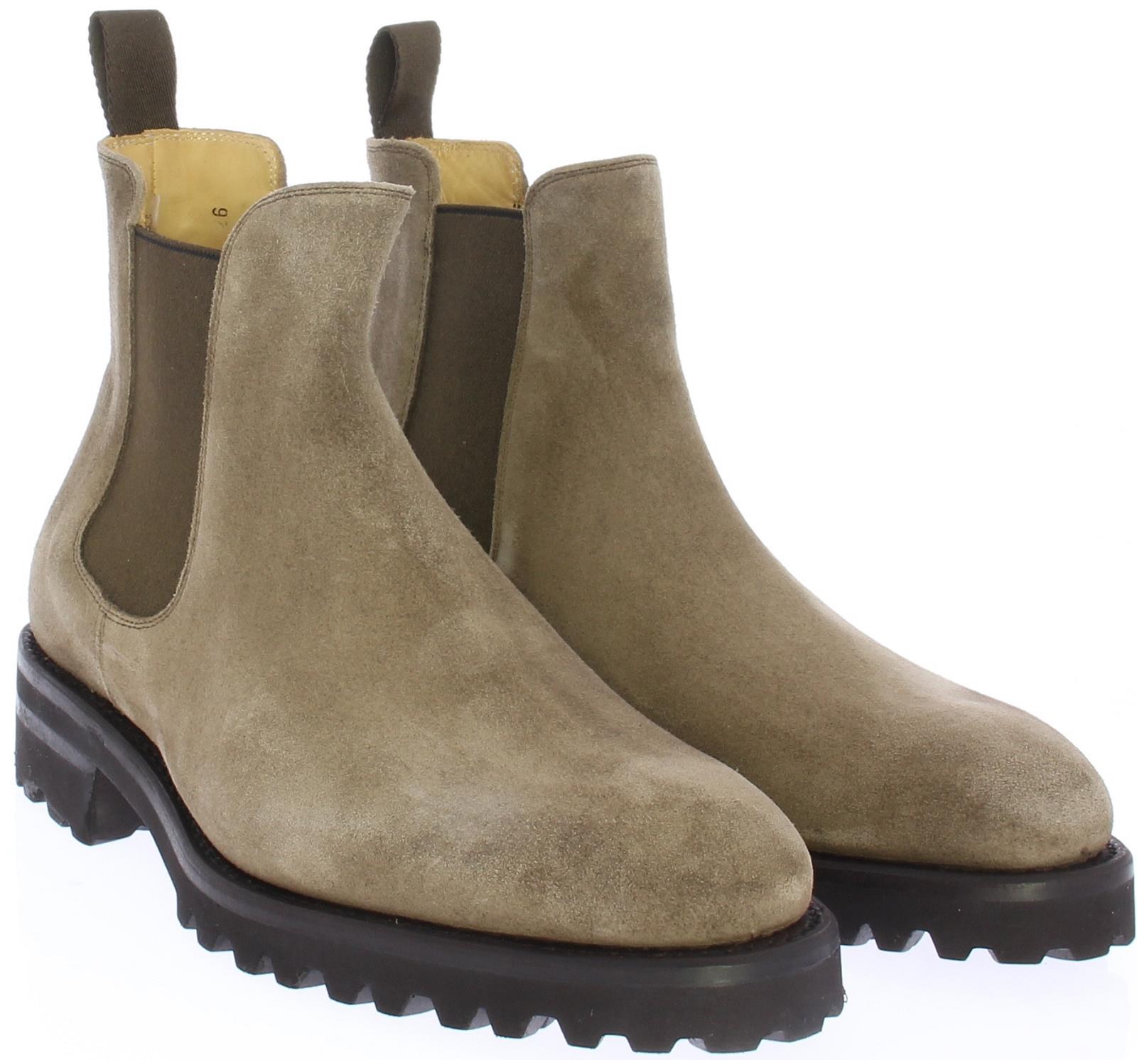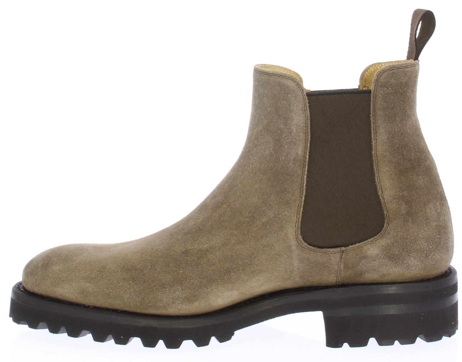 Taupe suede men's Chelsea boot from Carlos Santos. These shoes are made of taupe suede and have a brown rubber sole. The shoe has brown elastic on the sides and a leather lining.