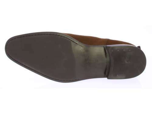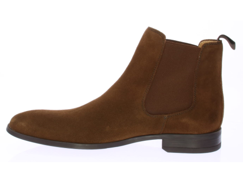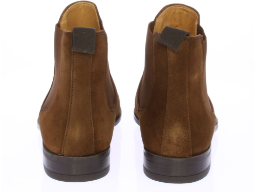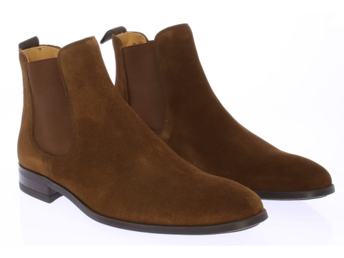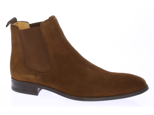 Cognac suede men's Chelsea boot from Valdorini. The shoe is leather-lined and has a rubber sole.
