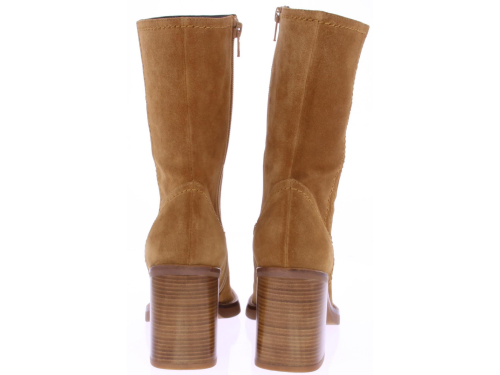 Cognac-colored suede three-quarter ladies' boot by Zinda. The boot has a round toe and closes with a zipper. The crepe sole has a small plateau. The heel height is 8 cm.