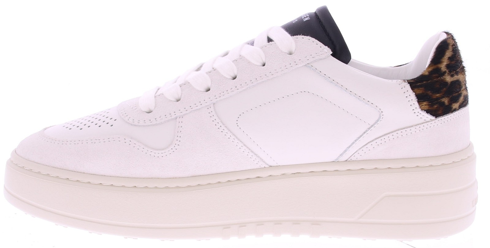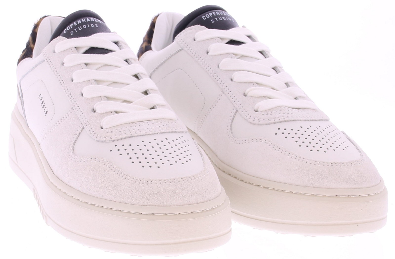 White leather women's sneakers from Copenhagen. These low-top sneakers, the CPH75, feature a perforated white leather toe cap with suede. The heel counter is made of leopard print pony hair. The interior is lined with soft leather. The footbed is removable. Perfect for everyday wear and easy to combine with a variety of outfits.