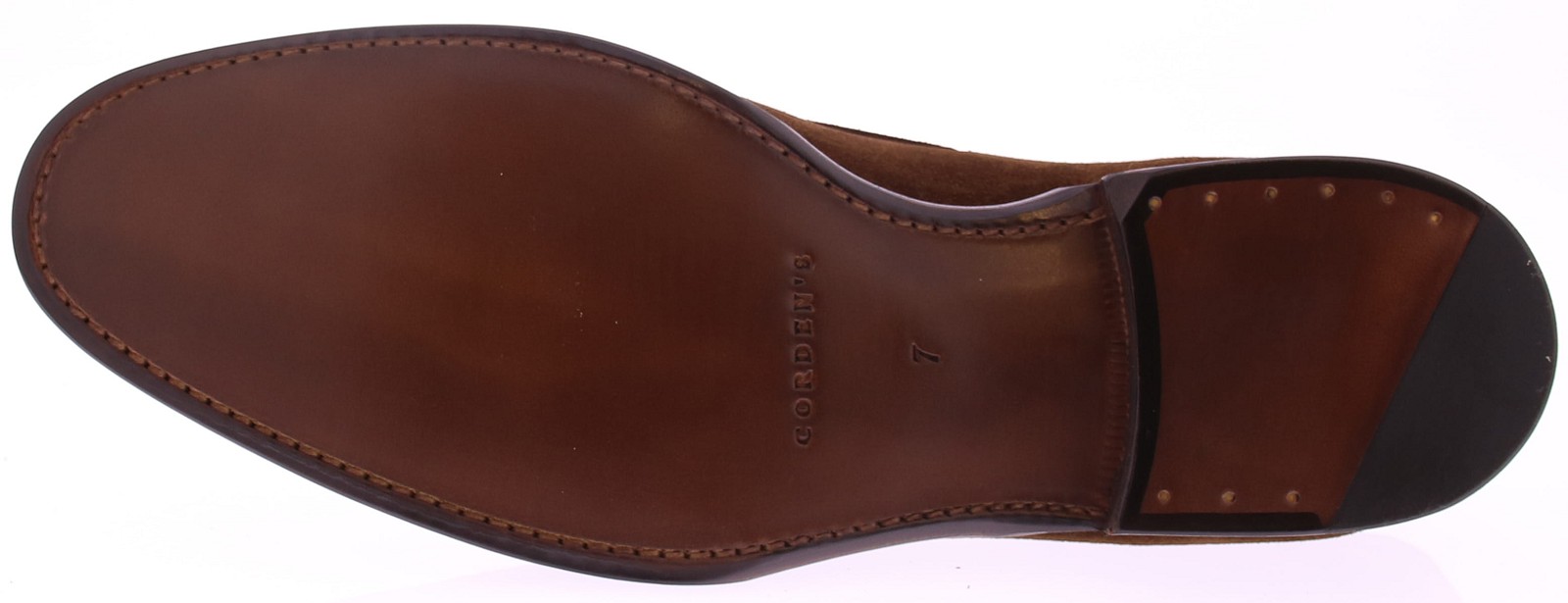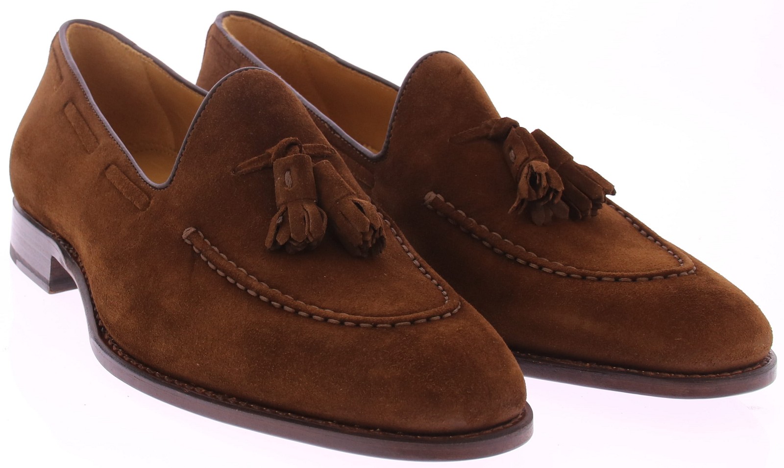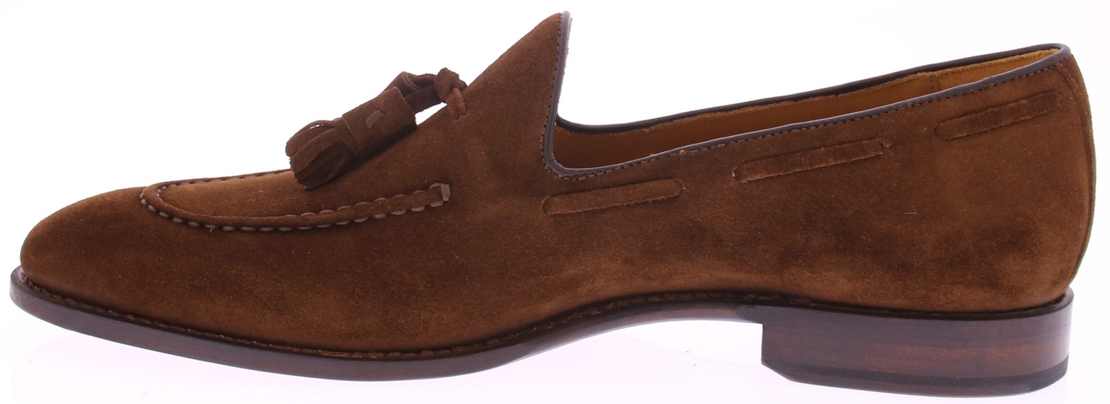 Mid-brown suede men's loafer with tassels from Corden's. This refined slip-on is handcrafted in Portugal using the traditional Goodyear-welted method, ensuring durable construction and optimal comfort. The soft suede in the warm shade of Rooswood gives the shoe a rich, luxurious look with a subtle depth of color. The decorative tassels and fine stitching emphasize the handcrafted character and classic elegance of this style. The leather sole enhances the stylish silhouette and offers stability with every step. The full leather lining and fixed footbed ensure a comfortable fit and a pleasant feel. A timeless loafer that pairs perfectly with both formal and casual outfits, offering an unmistakable blend of Portuguese quality and refined class.