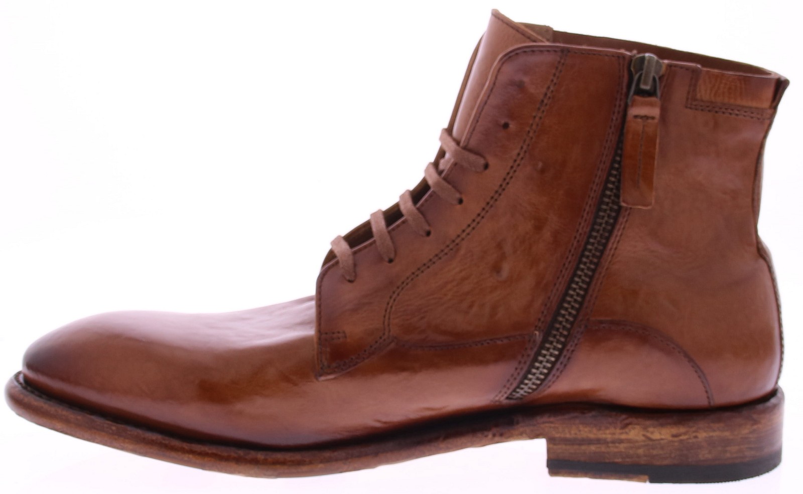 Cognac Buffalo Leather Boot – Washed Leather, Authentic Finish, and Italian Character This rugged and stylish men's boot in cognac-colored washed buffalo leather is the perfect blend of vintage flair and modern functionality. The washed leather creates a lived-in, unique look with subtle color nuances—each shoe is unique. The hand-polished finish enhances the artisanal character of this robust boot. With a full leather lining, this boot offers a breathable and comfortable fit, while the leather sole with rubber insert provides extra grip and durability. This makes it ideal for everyday use without compromising on style.