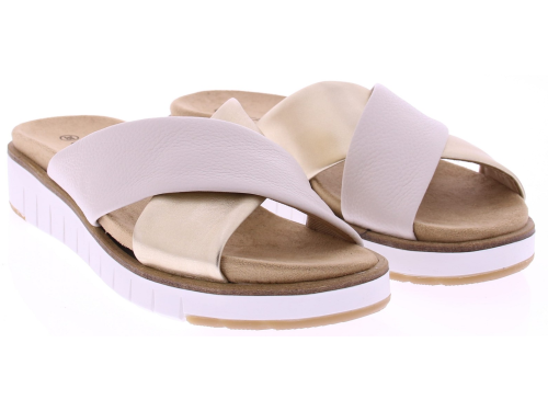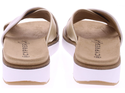 Cream, gold-colored leather women's sandals from Cypres, model Mia. These sandals feature a cross-strap made of soft, comfortable leather and a removable insole, making it easy to insert your own insole. The slightly raised 2 cm sole allows for a natural gait and comfortable wear. An elegant, summery sandal that effortlessly combines style and comfort.
