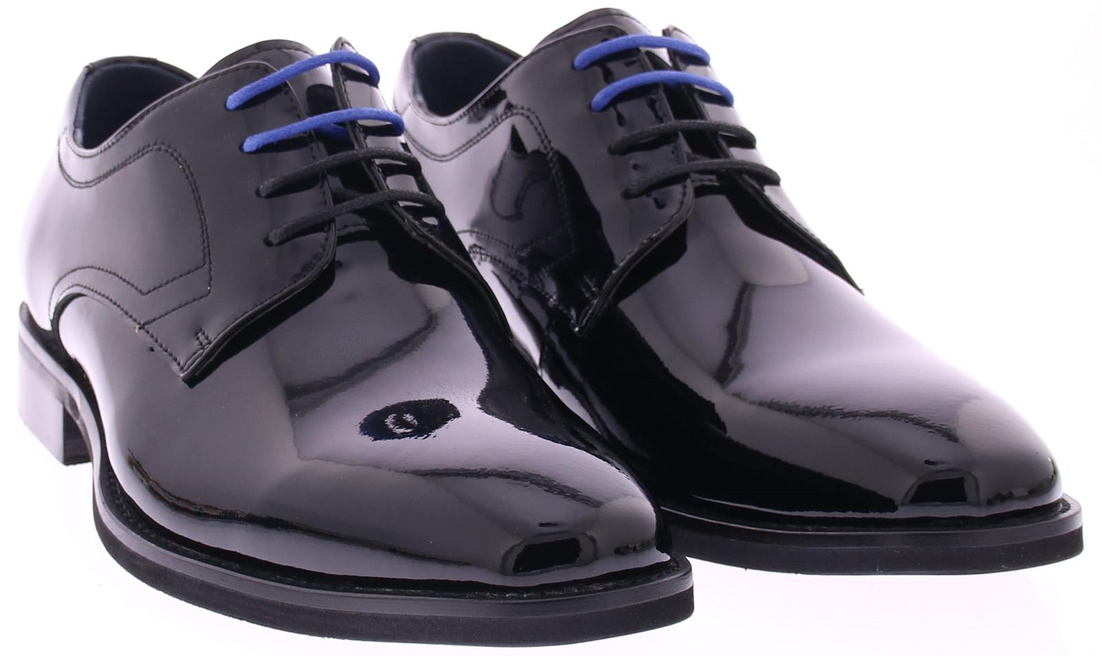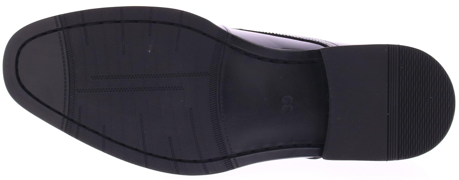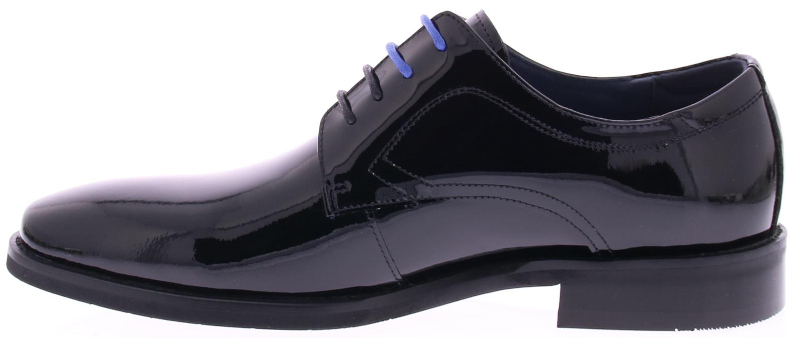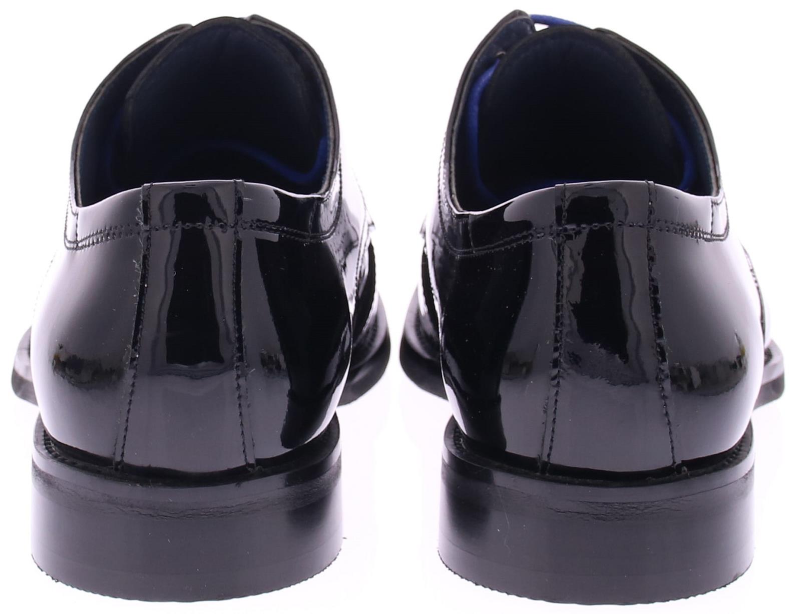|Daniel Kenneth patent leather shoe on rubber sole with flap closure in black. The lining is leather.|