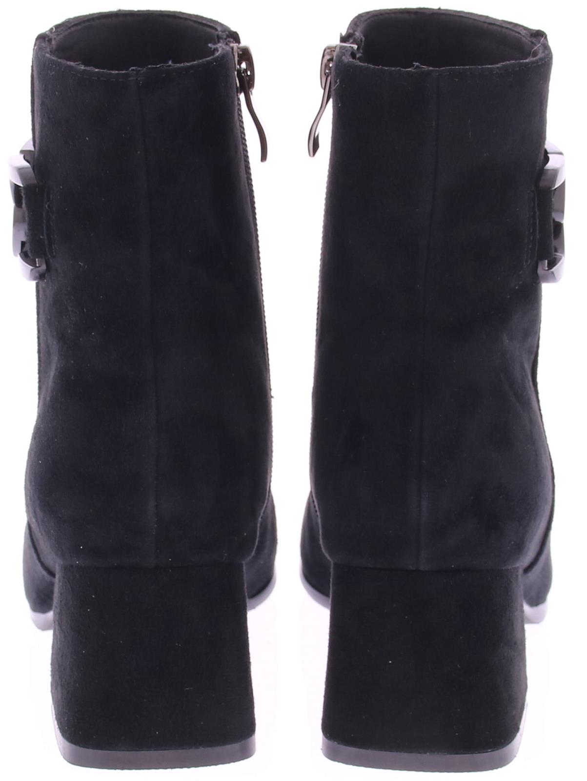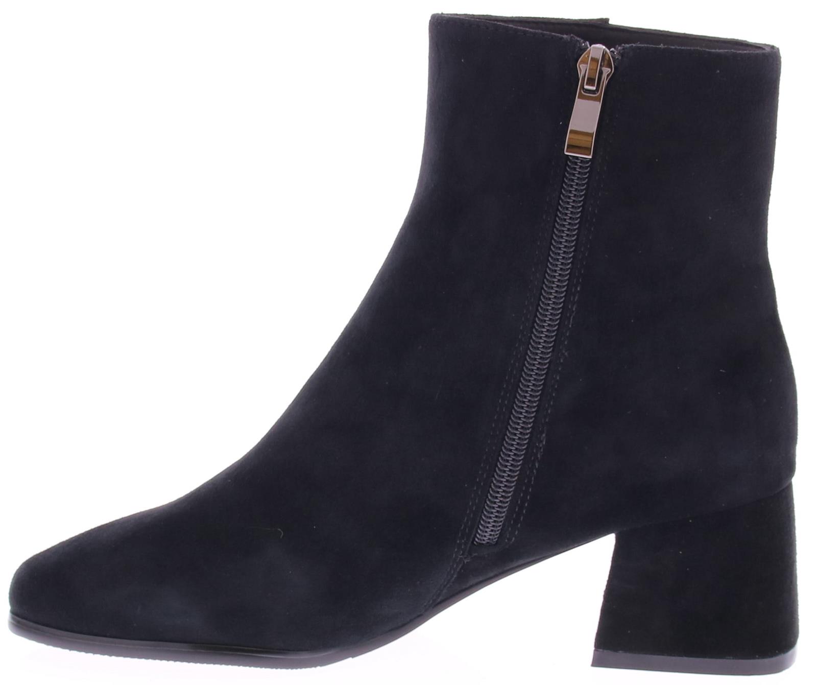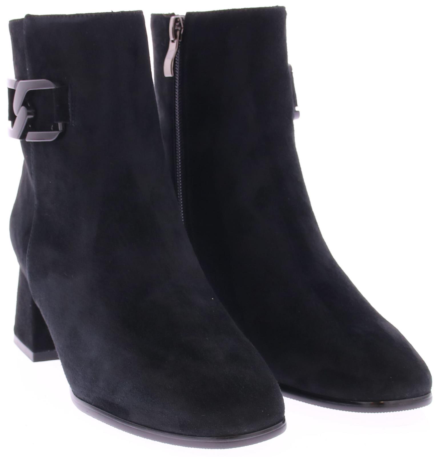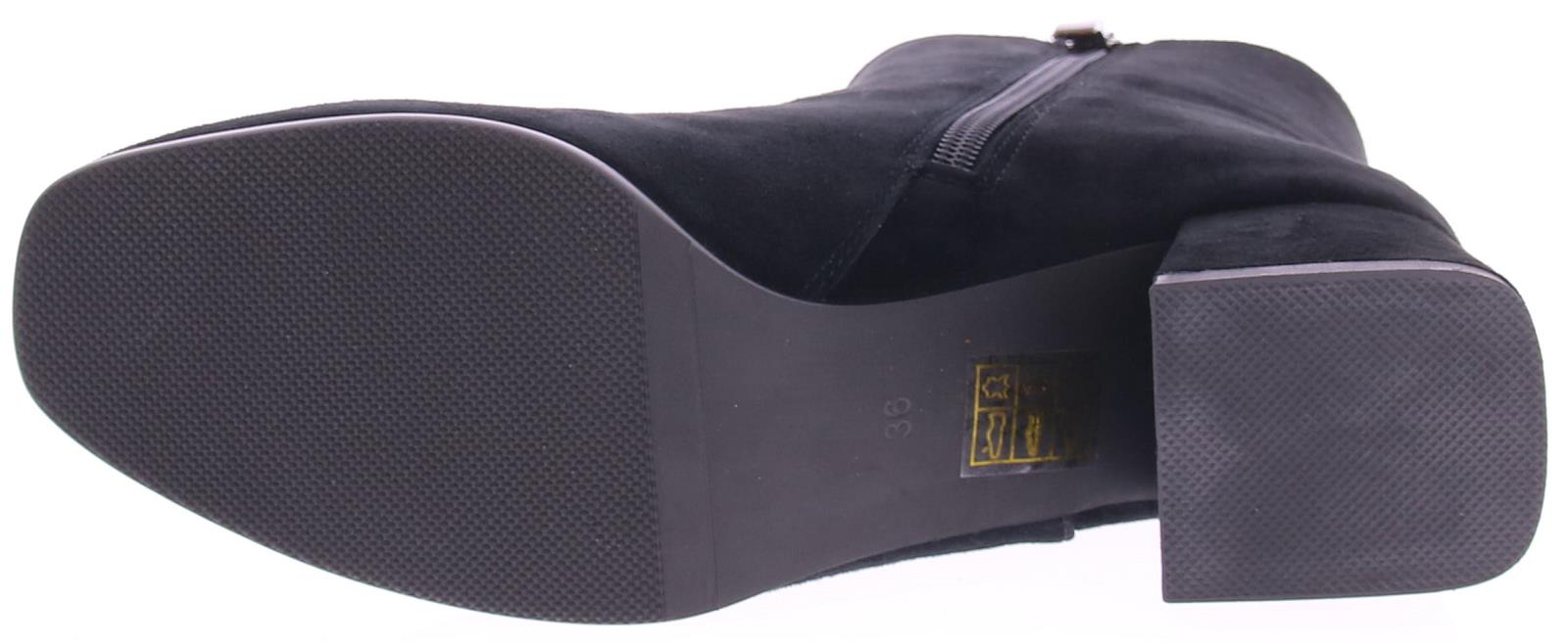 Black suede women's ankle boot from Di Lauro. This boot is made of black suede. The inside of the shaft has a zipper, and the outside is decorated with a lovely trim. The interior is made of leather, and a sturdy heel counter contributes to the comfort of walking. The rubber outsole has a medium tread, and the heel measures 5 cm.