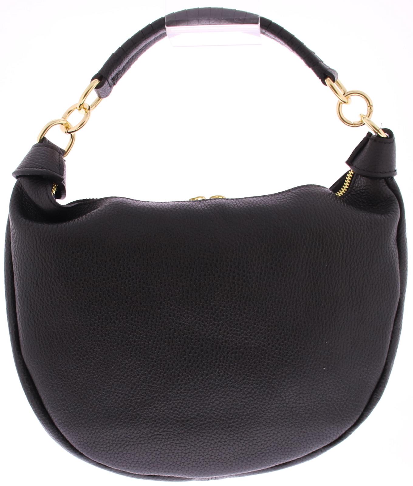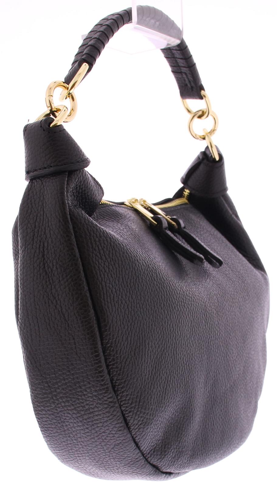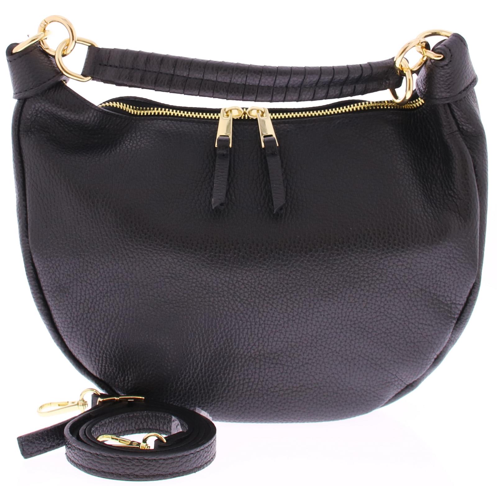 Black leather women's bag by Di Lauro. Crafted from supple leather with a fine grain. The bag closes with a gold zipper. The original quilted leather shoulder straps are removable. The bag also includes a long shoulder strap. Dimensions: 25x18x9.5 cm.