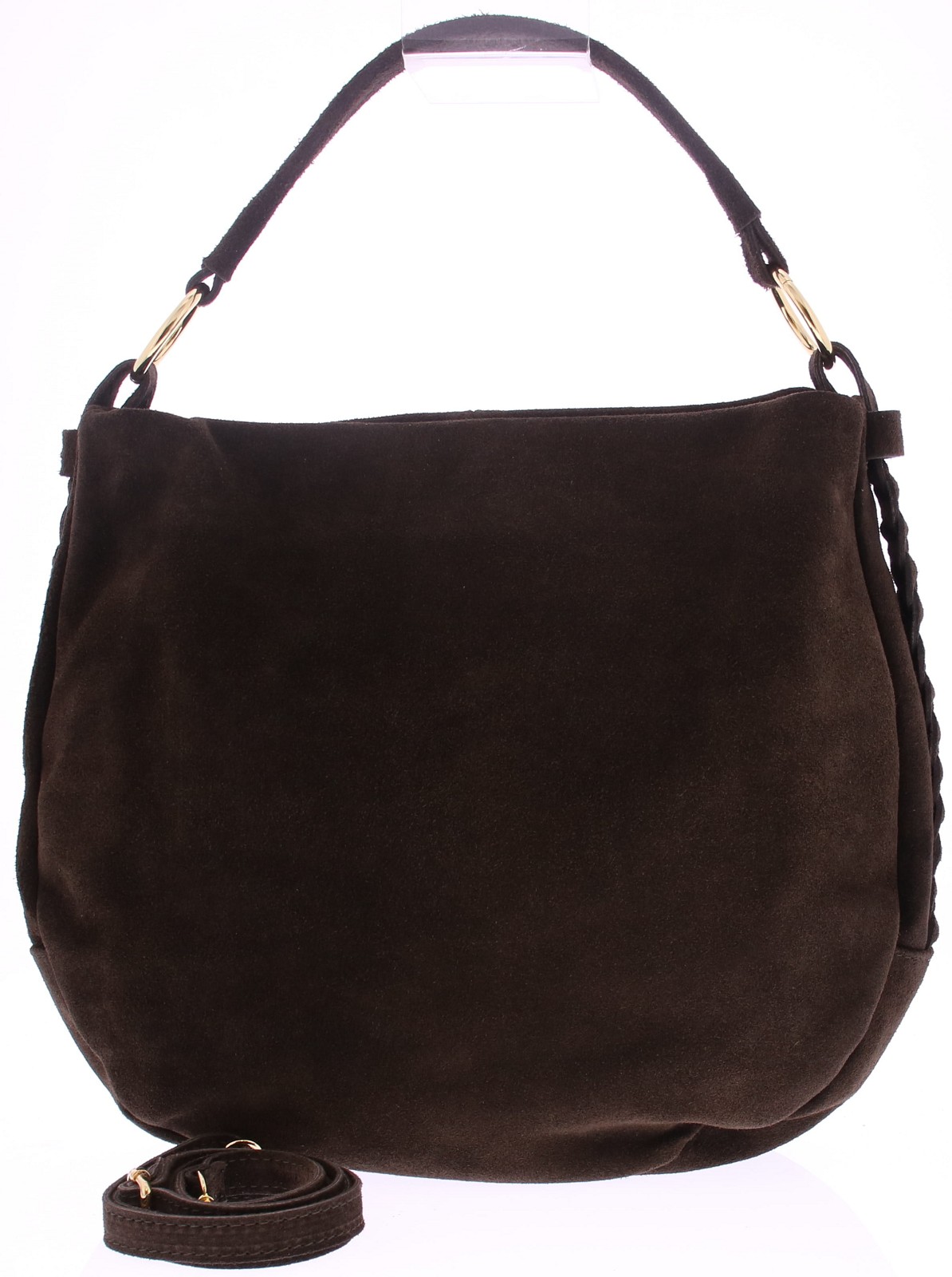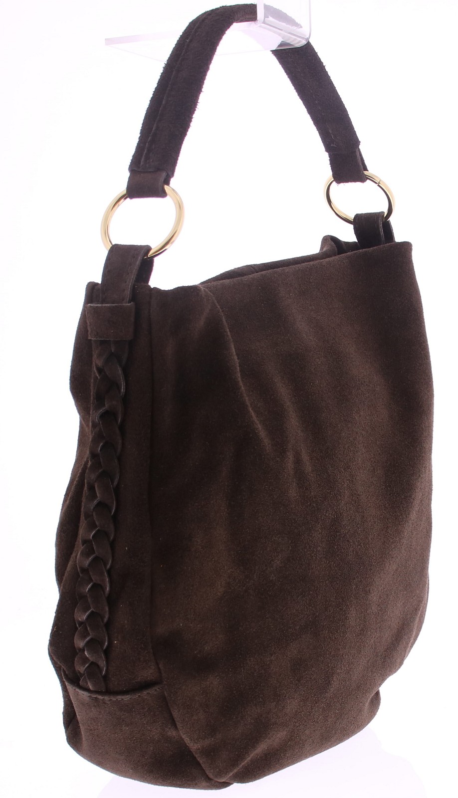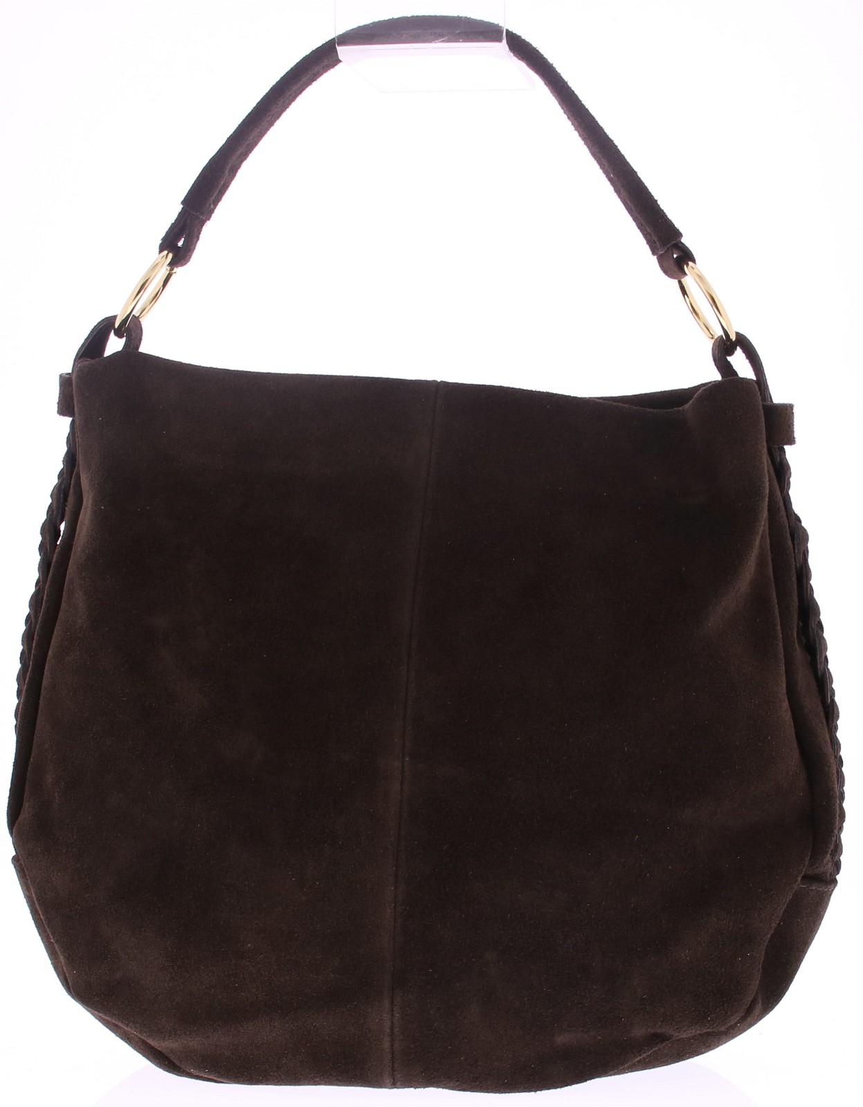 Dark brown suede women's bag from Di Lauro. This casual bag features two braided decorative straps on the sides. The shoulder strap has two gold-colored rings at the end. The bag closes with a zipper and measures 37x32x9 cm.