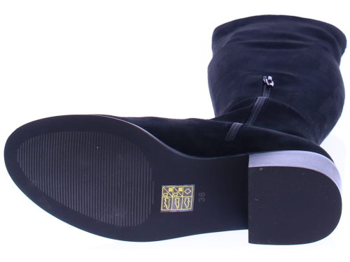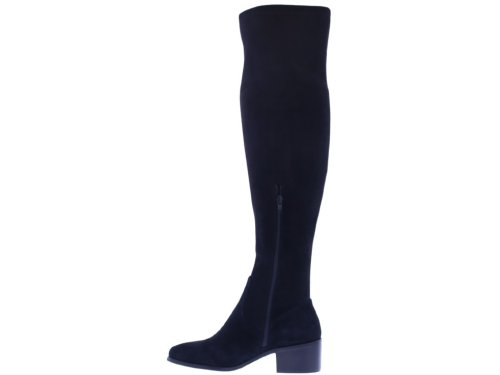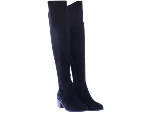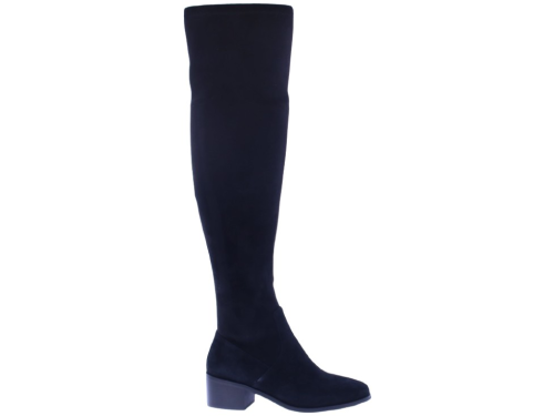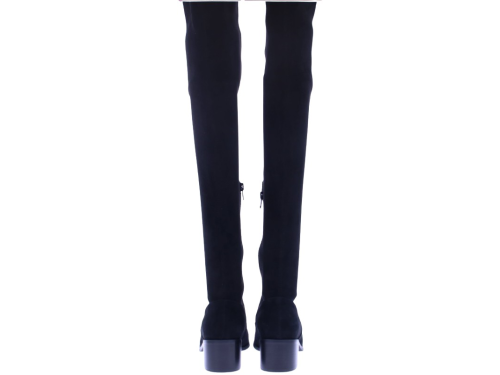 Black suede stretch boot for women from Di Lauro. This over-the-knee boot is made on a round last with a 4 cm block heel. The suede stretch shaft reaches just above the knee and fits snugly around the leg. The footbed is leather and the sole is rubber.