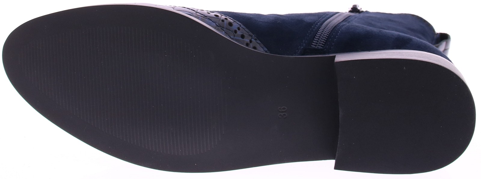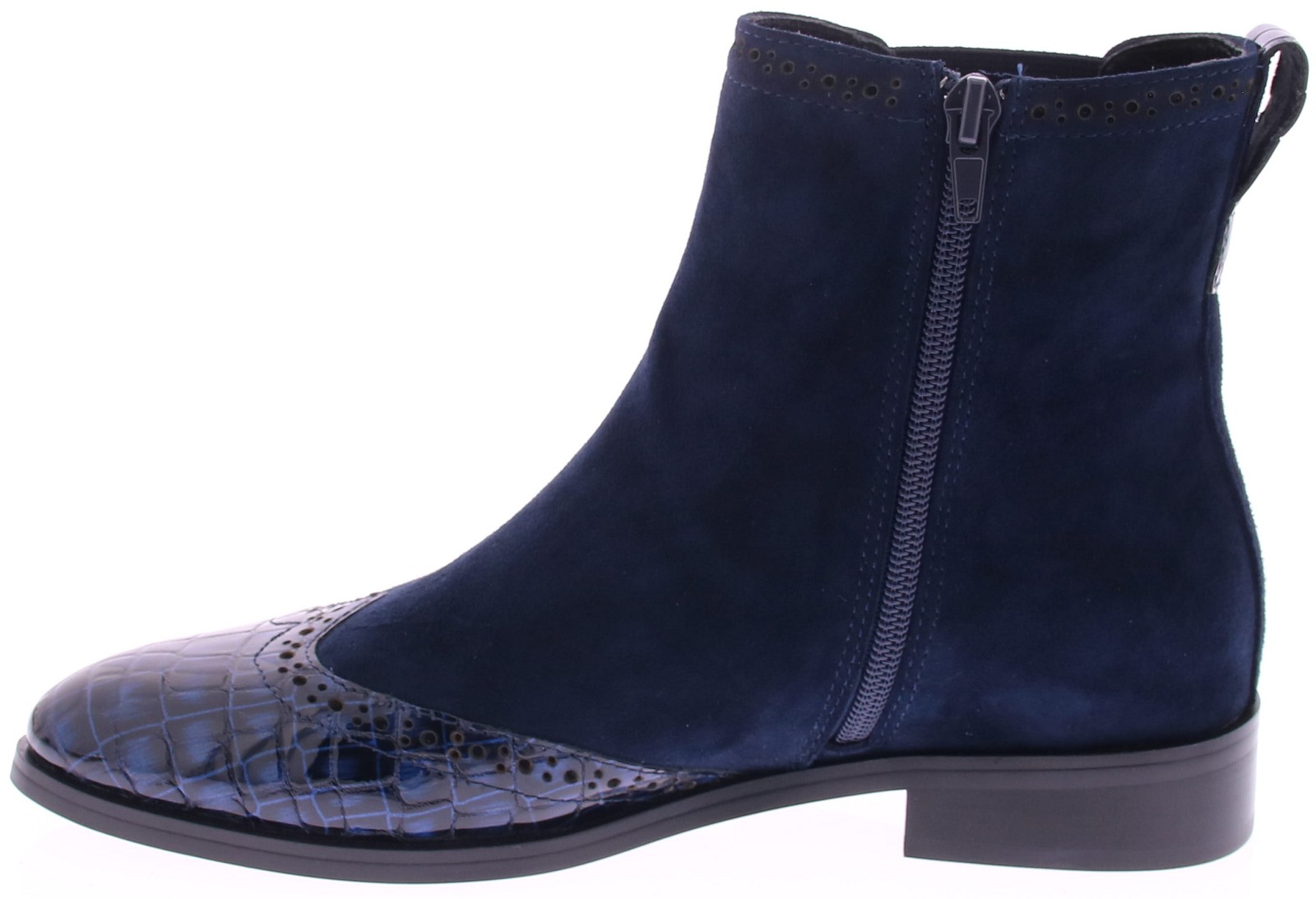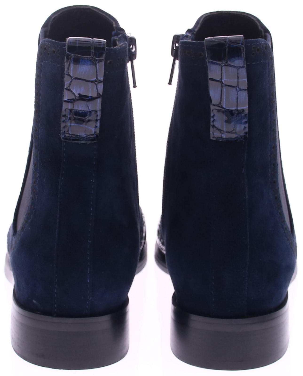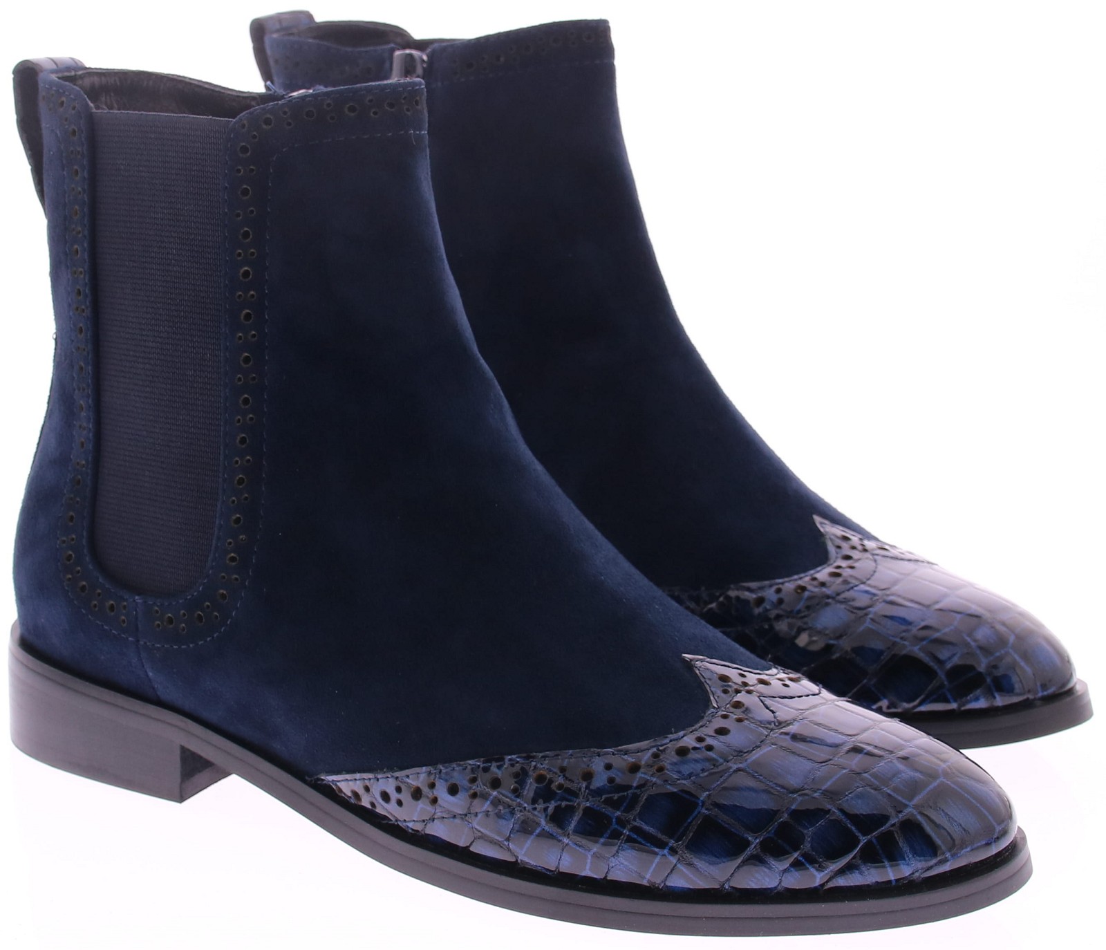 Dark blue women's Chelsea ankle boots from Di Lauro. Crafted from refined suede with a dark blue patent leather toe cap featuring a crocodile print. Inside, they have a zipper, a leather lining, and a rubber sole. A perfect shoe for those looking to add a touch of flair to a classic look.