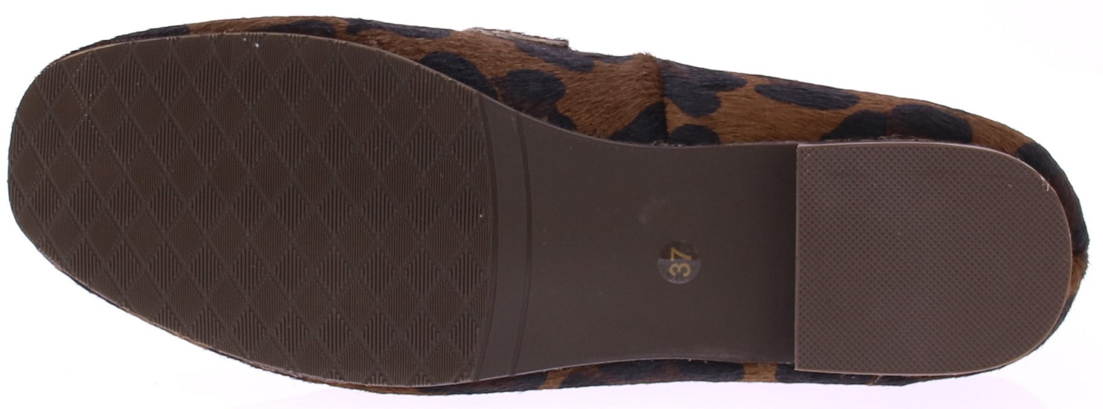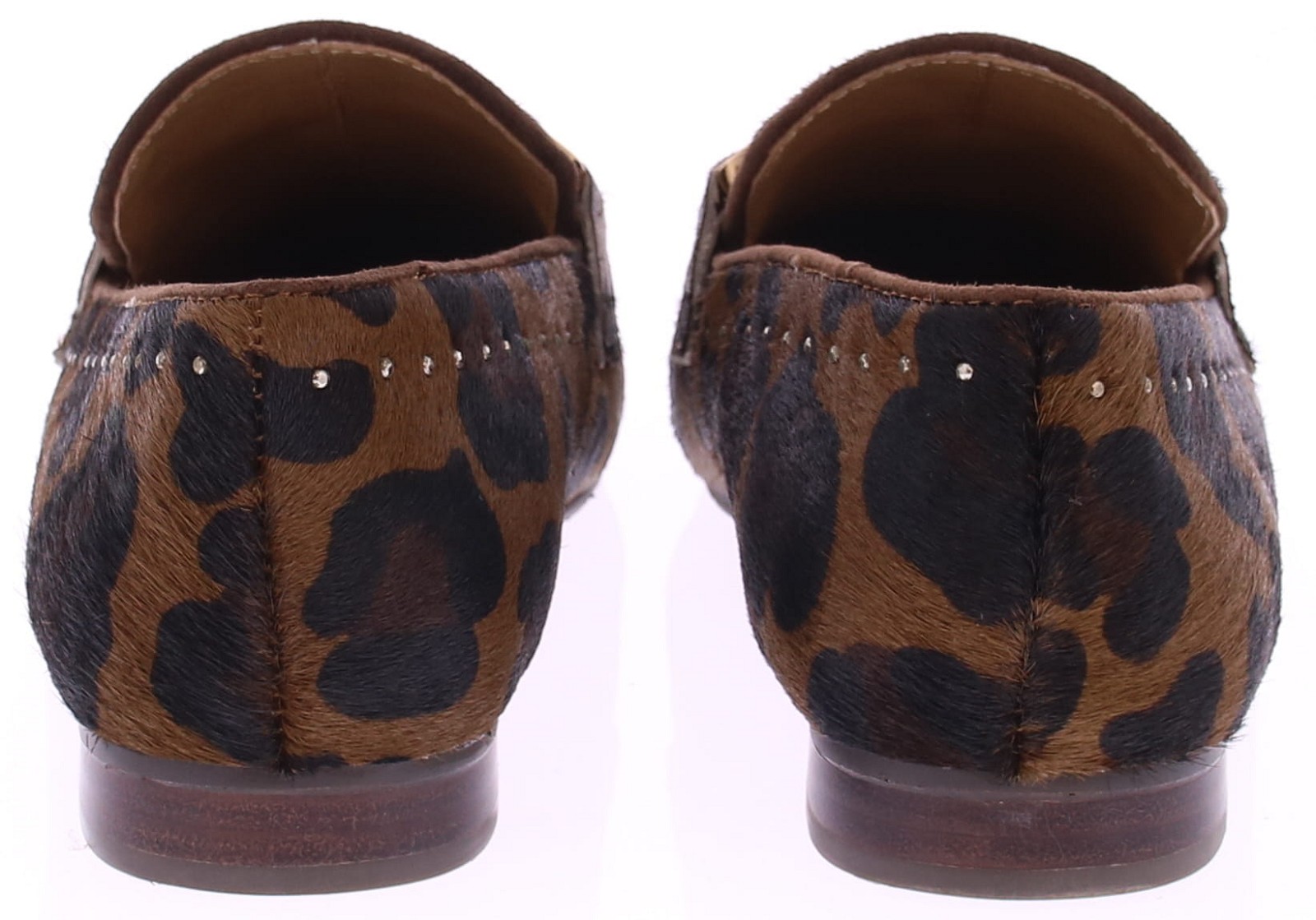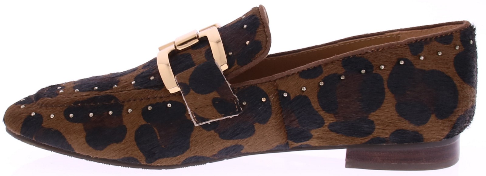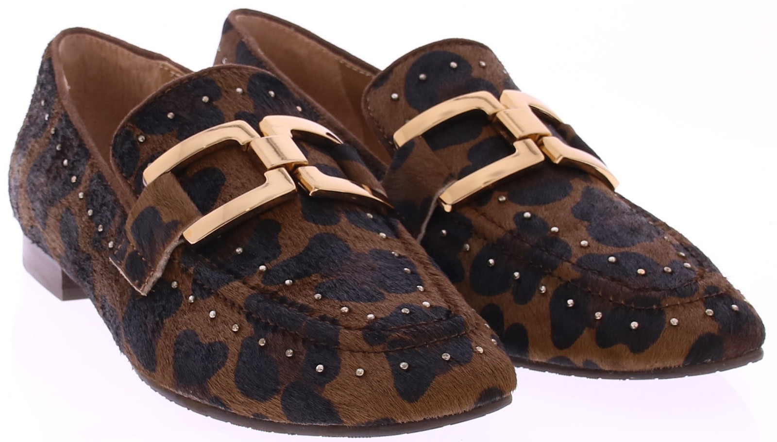 Dark brown leopard print pony hair women's loafer from Di Lauro. This oval-shaped loafer features a gold-colored bit on the instep and attractive studs around the shoe. This model is leather-lined, has a fixed footbed, a synthetic sole, and a low 2-centimeter heel. This beautiful loafer adds a chic touch to any outfit!
