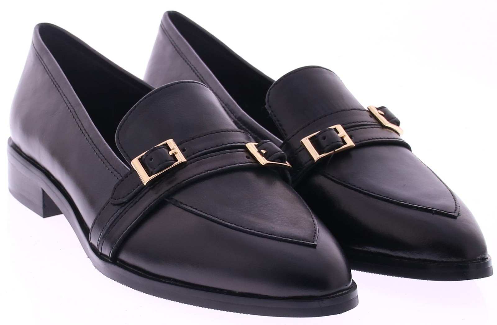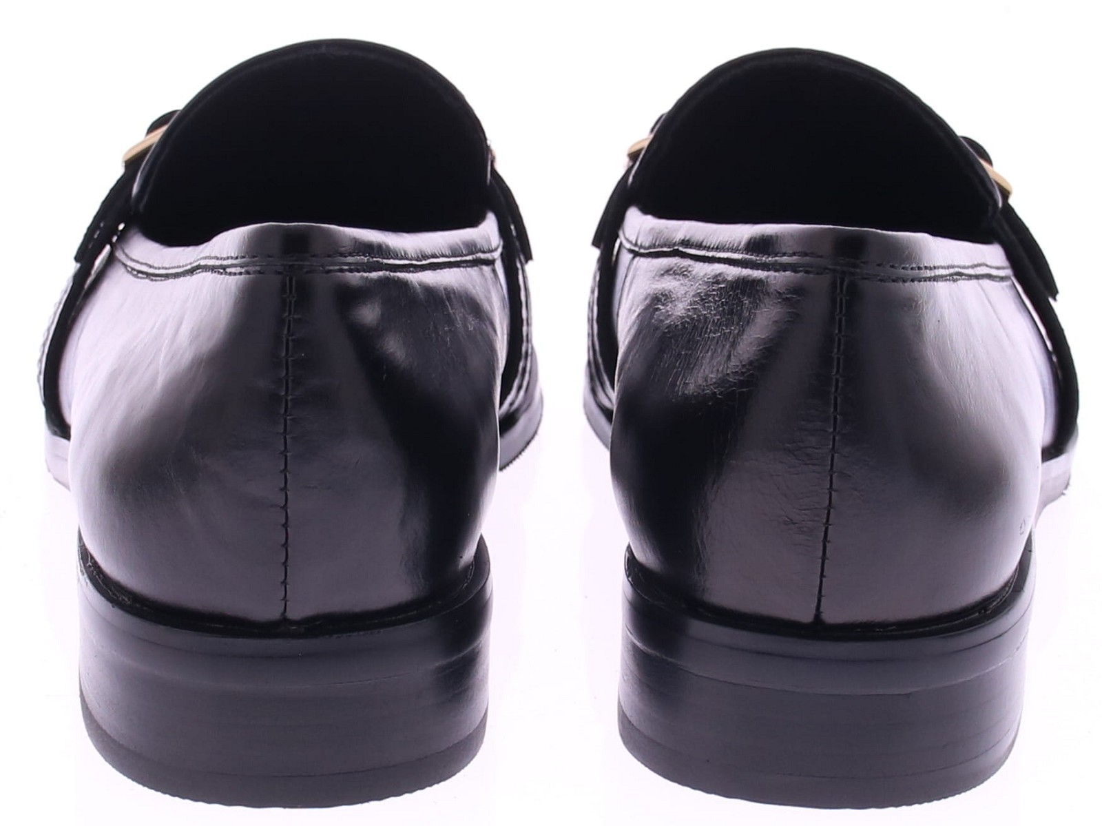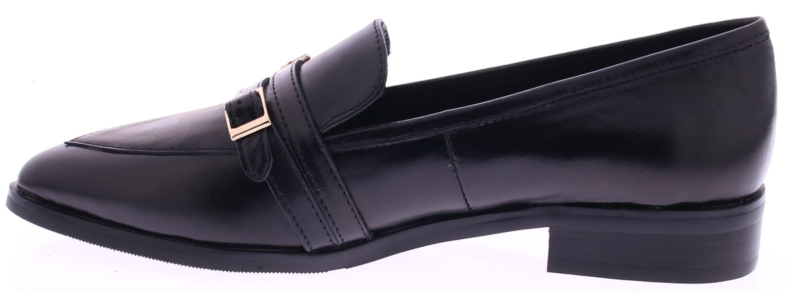 Black leather women's loafer from Di Lauro. This loafer has an oval design and features a matching strap with two small buckles across the instep. This model is leather-lined, has a fixed footbed, a synthetic sole, and a low 2-centimeter heel. This beautiful loafer adds a chic touch to any outfit!