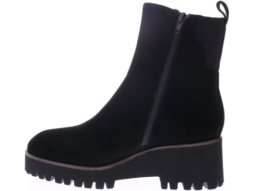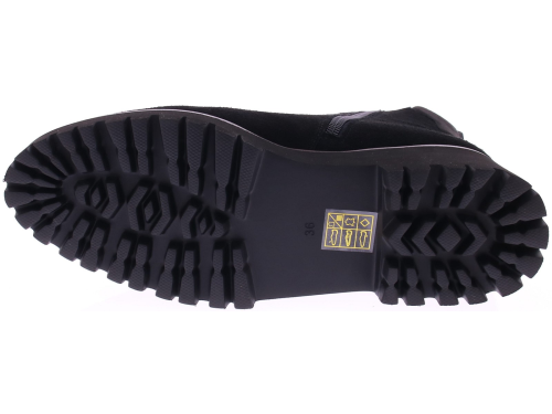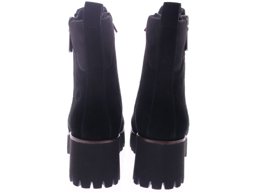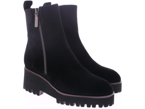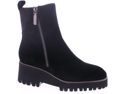 Black suede women's ankle boot from Di Lauro. Crafted from black suede, these ankle boots feature an inner zipper and a decorative zipper on the outer side. The chunky rubber treaded sole with subtle brown accents creates a bold contrast and offers excellent grip.