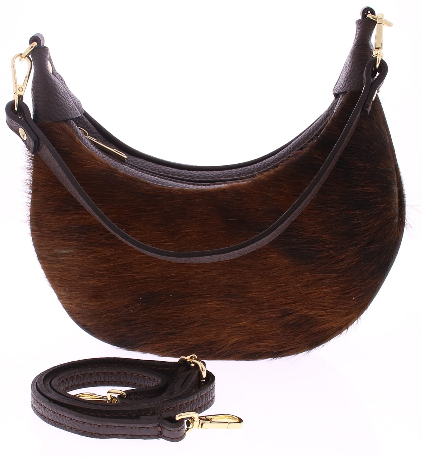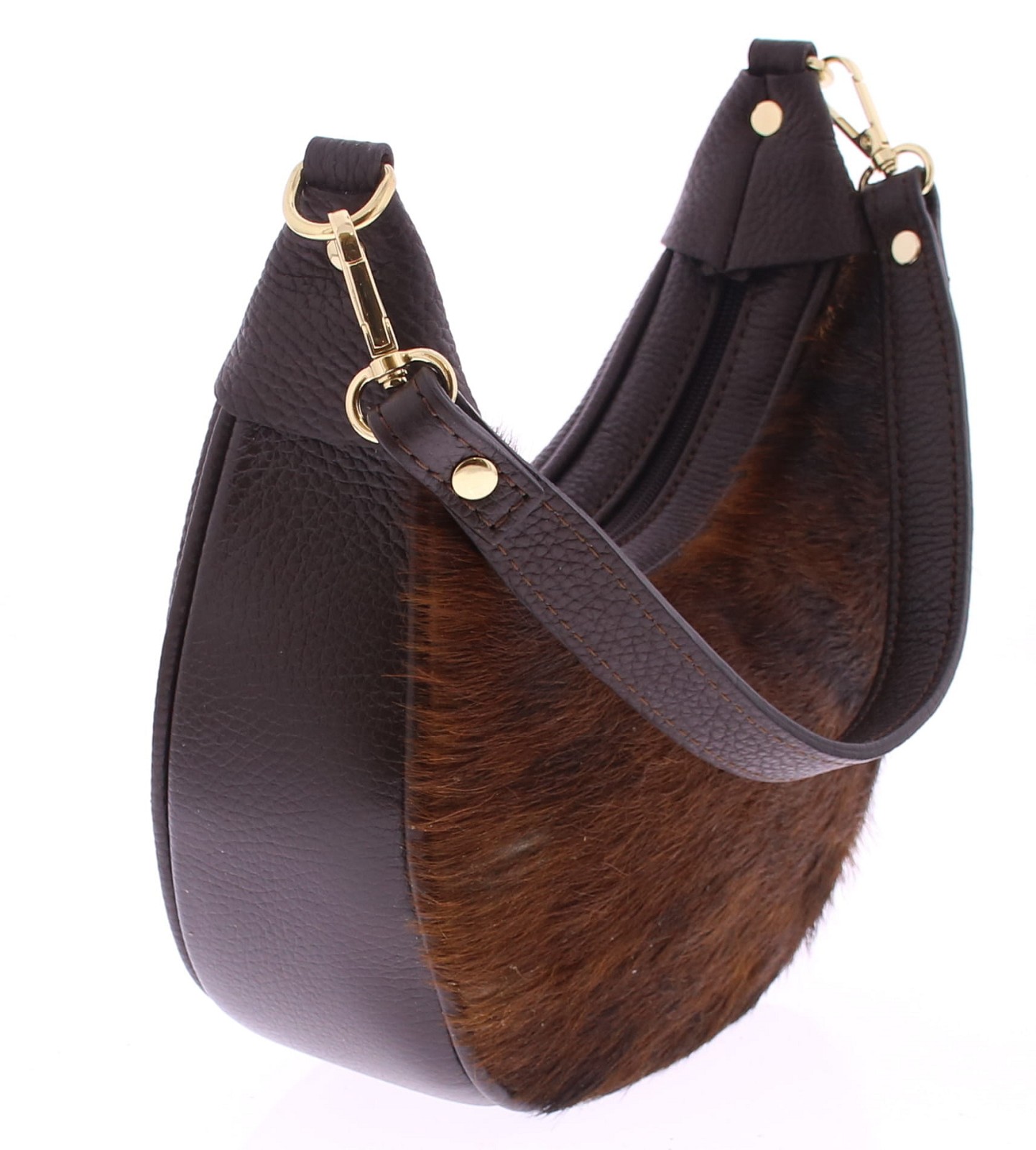 Di Lauro's brown pony women's bag. Made of leather on the sides and brown pony on the front. The dimensions are 33x22x10 cm. The shoulder strap is made of leather and finished with gold-colored trim. The bag closes with a zipper.