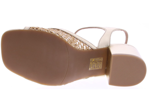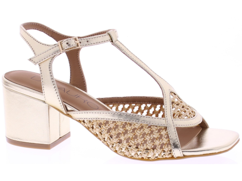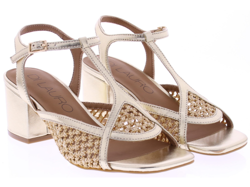 Gold-colored women's sandals from Di Lauro, model Demetria. These sandals feature a T-strap with raffia inserts for a summery look. The 5 cm block heel has a thin sole. Crafted from supple leather and finished with attention to detail, these stylish sandals are comfortable to wear on warm days.