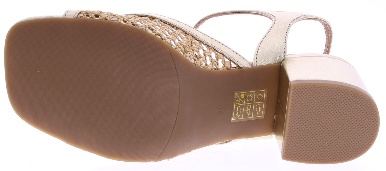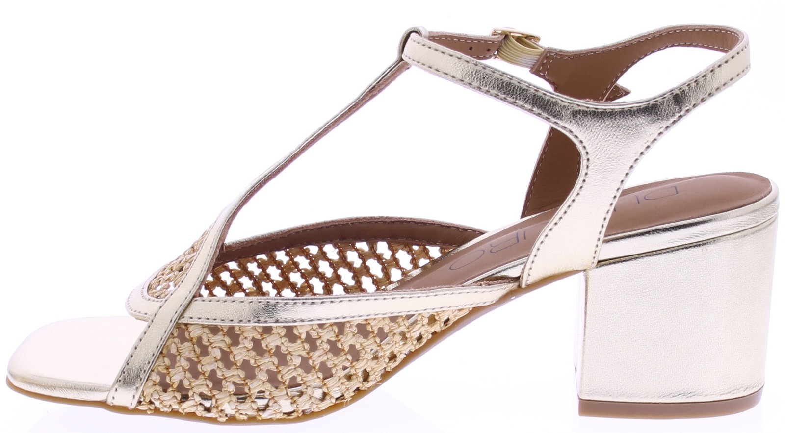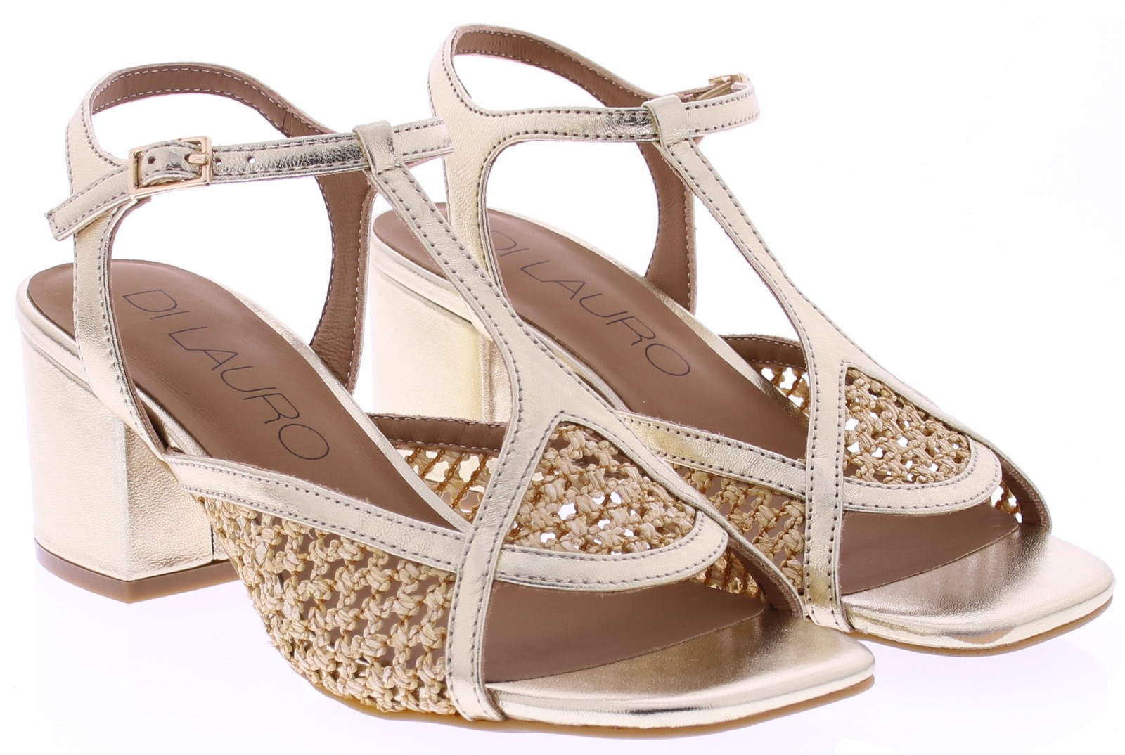 Gold-colored women's sandals from Di Lauro, model Demetria. These sandals feature a T-strap with raffia inserts for a summery look. The 5 cm block heel has a thin sole. Crafted from supple leather and finished with attention to detail, these stylish sandals are comfortable to wear on warm days.