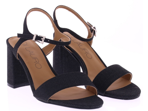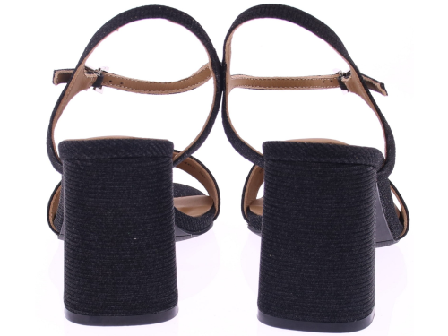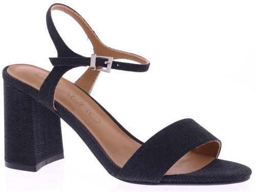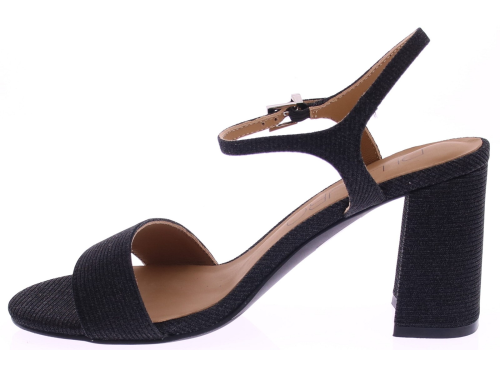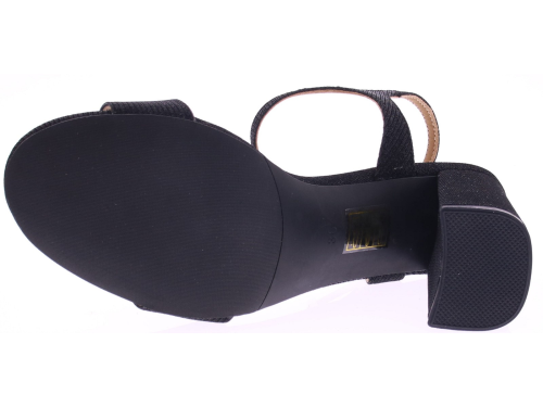 Black glitter women's sandals from Di Lauro, model Desdemona. These sandals feature a wide strap across the forefoot and an adjustable ankle strap with a buckle for a secure fit. The 8cm block heel provides a modern look and comfortable walking. Made of a shiny glitter fabric that catches the light beautifully, perfect for festive occasions and summer days. "Discover other Di Lauro women's pumps at Klijsen."