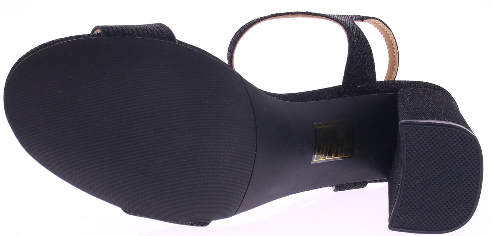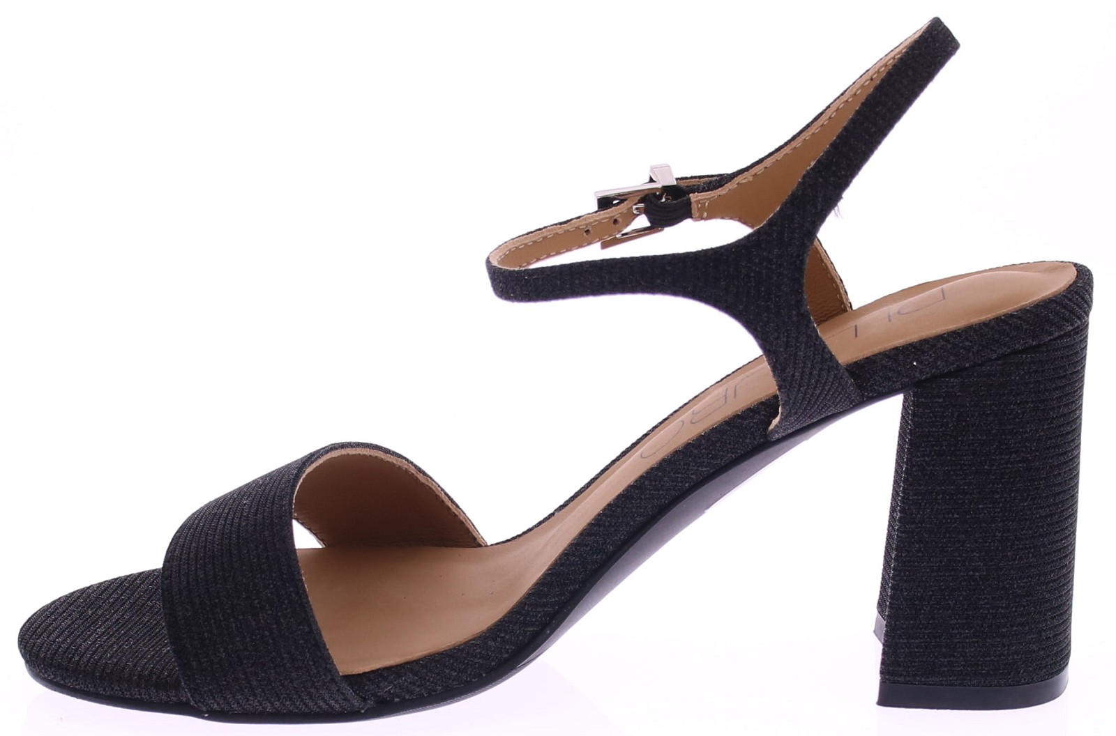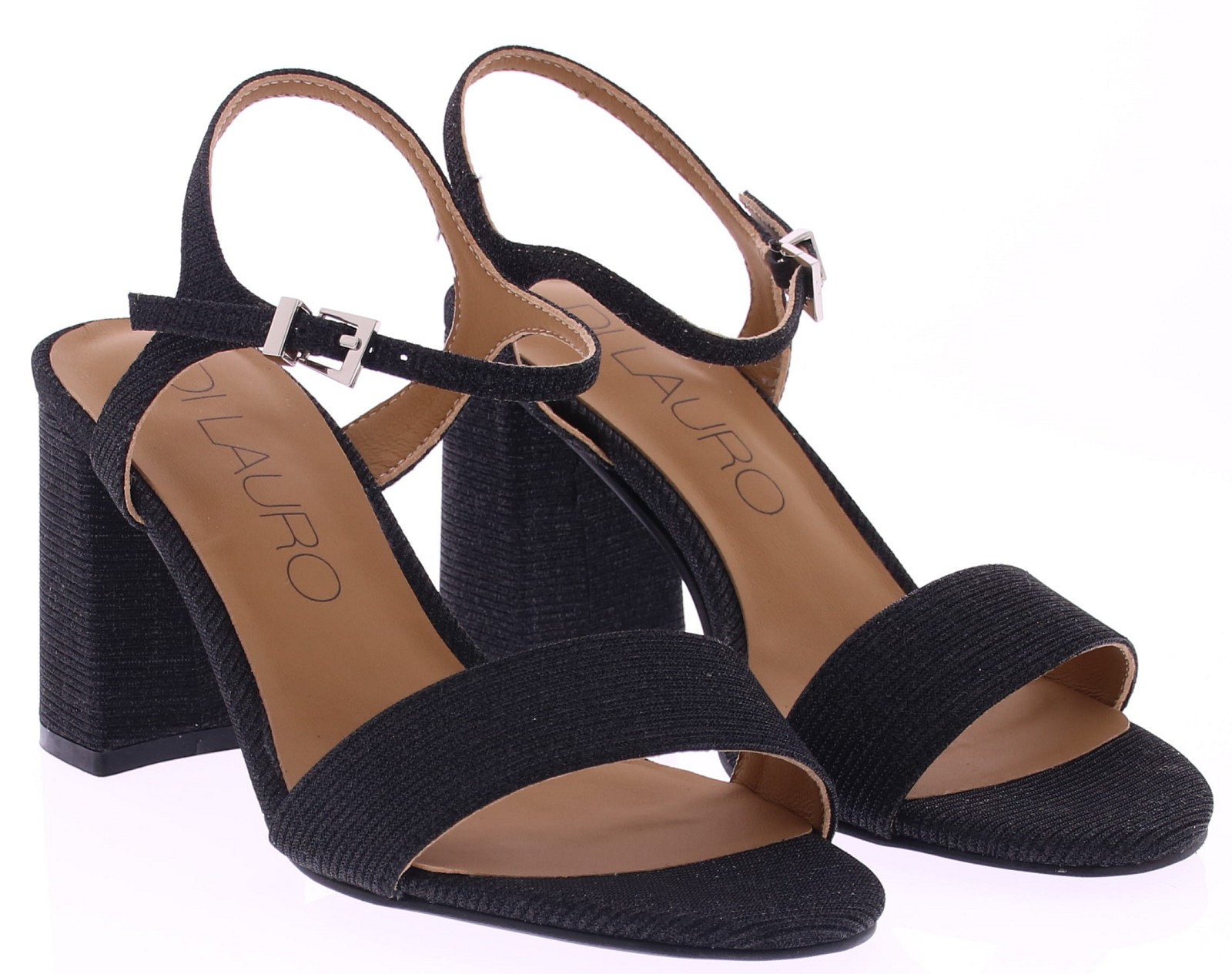 Black glitter women's sandals from Di Lauro, model Desdemona. These sandals feature a wide strap across the forefoot and an adjustable ankle strap with a buckle for a secure fit. The 8cm block heel provides a modern look and comfortable walking. Made of a shiny glitter fabric that catches the light beautifully, perfect for festive occasions and summer days. "Discover other Di Lauro women's pumps at Klijsen."
