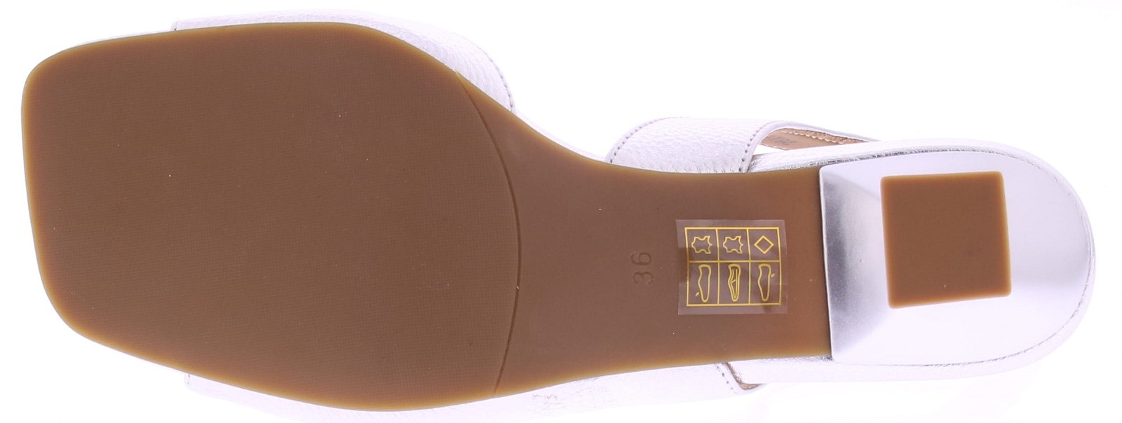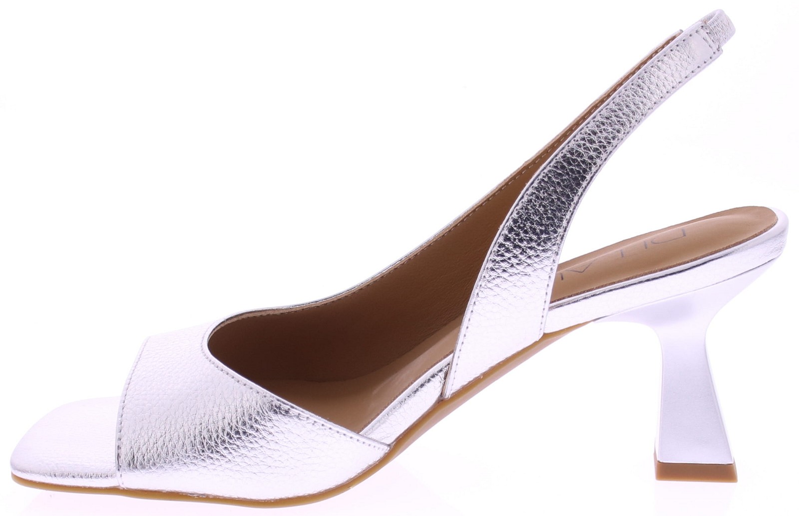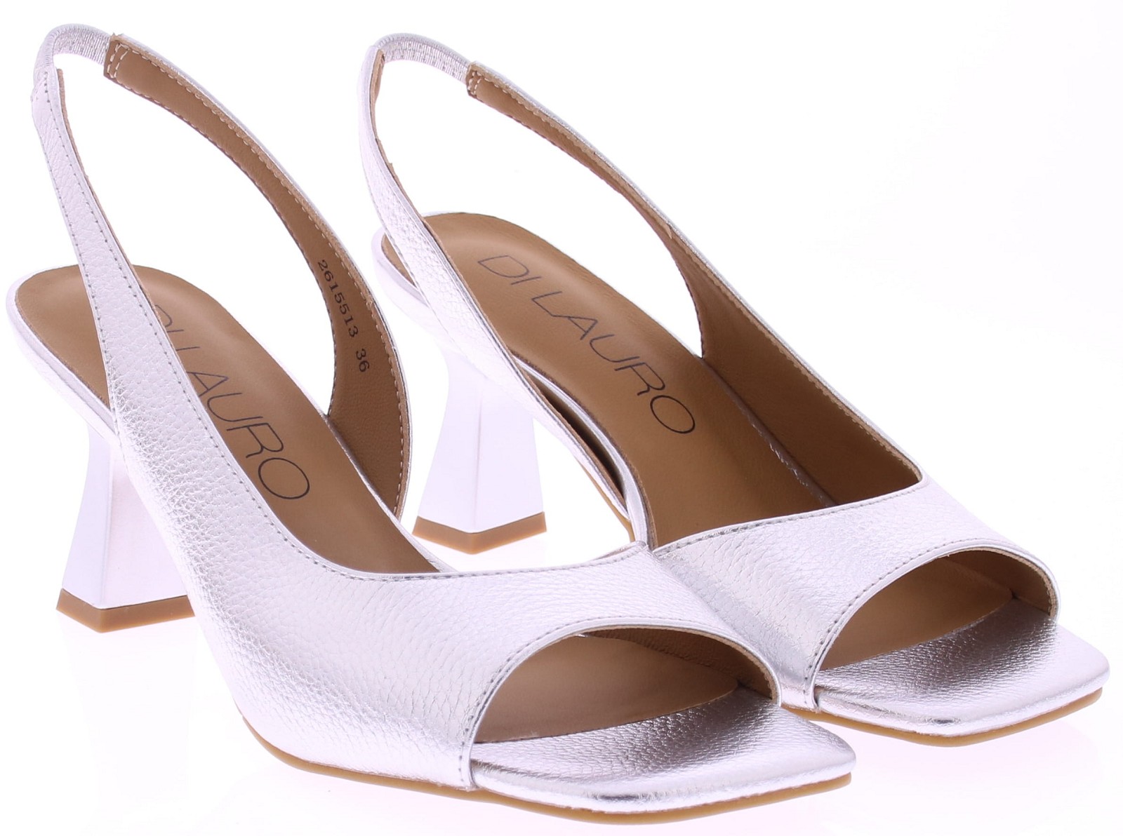 Silver leather women's sandal from Di Lauro, model Wiberta. This sandal has a slightly flared 6 cm heel. The heel is elasticated for a good fit and easy entry. Made of supple leather with a subtle sheen and a polished finish. A stylish shoe suitable for festive occasions and summer days. "Discover other women's shoes from Di Lauro at Klijsen."