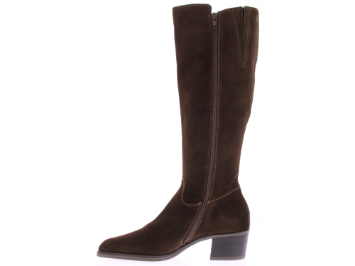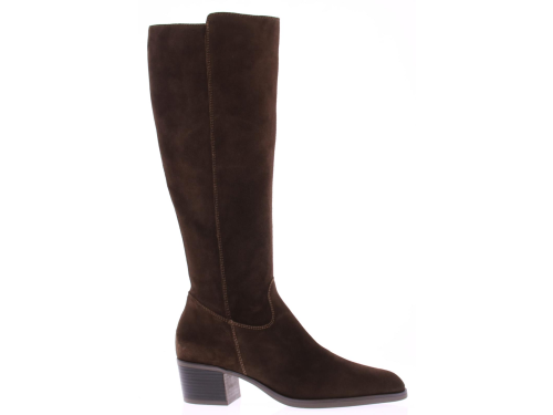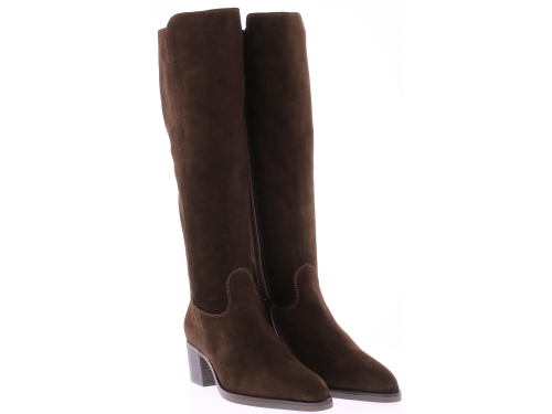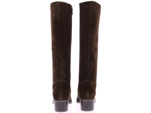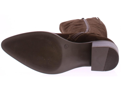 Dark brown suede high women's boots from DL Sport. These beautiful, basic high boots have a flexible sole and a zipper. The slanted heel is 4 cm high. These comfortable city western boots look great with trousers or styled more stylishly with a dress. The footbed is removable.