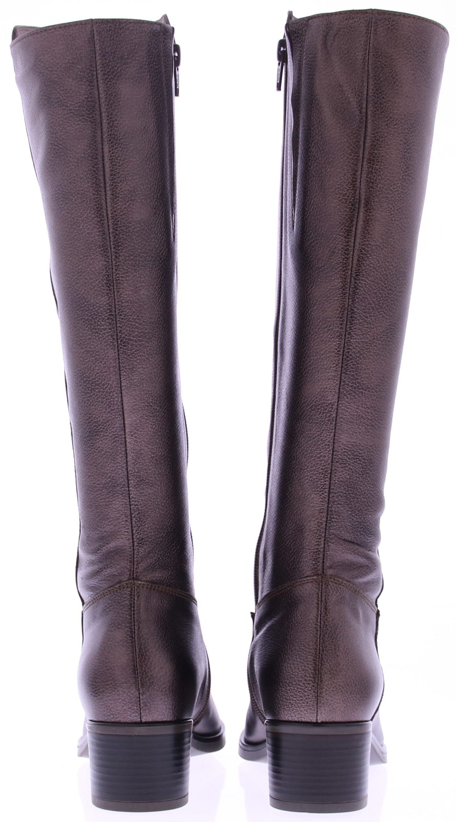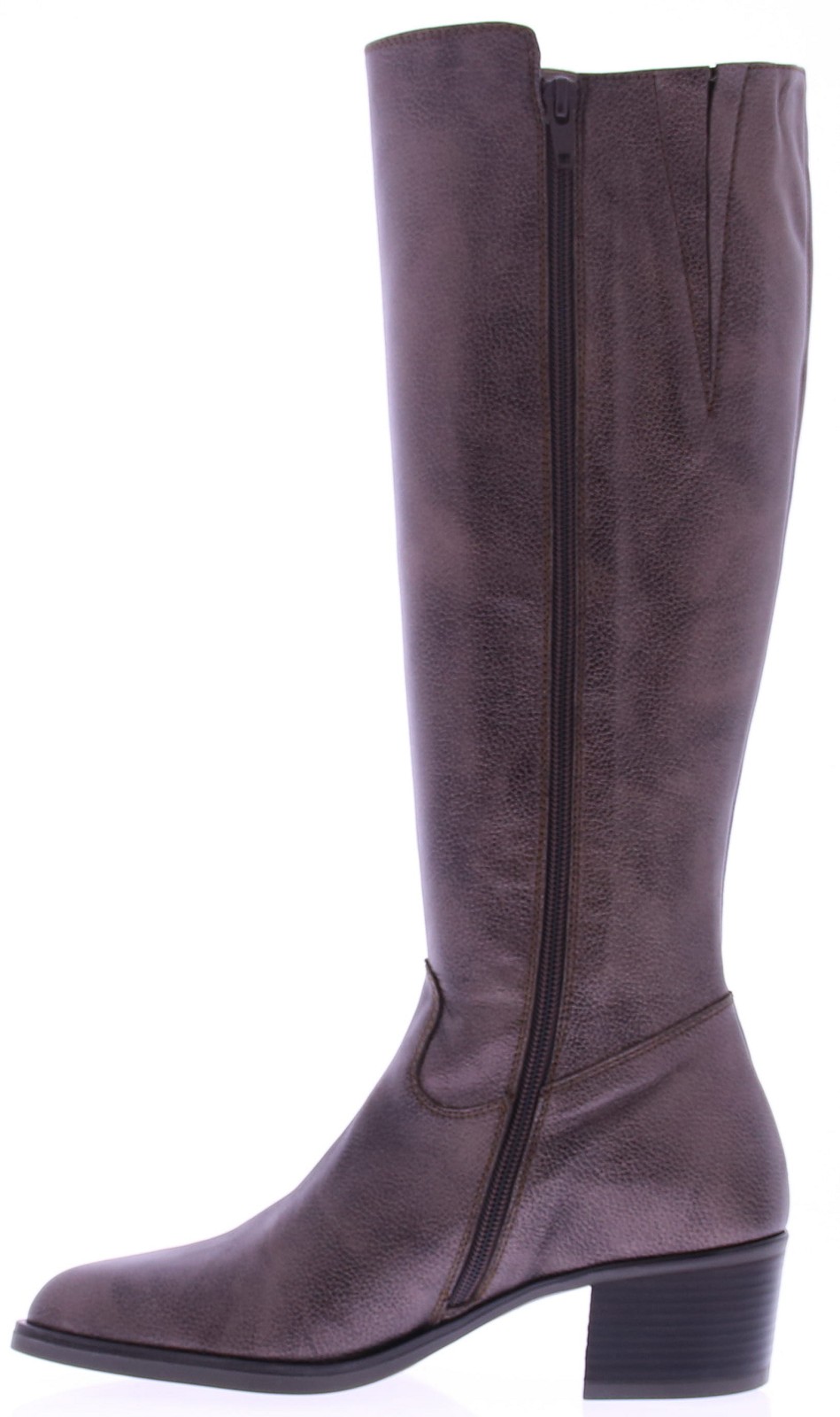 Brown metallic leather tall women's boot from DL Sport. This sporty, elegant tall boot is the perfect blend of luxury, comfort, and functionality. Crafted from high-quality grain leather—supple leather with a fine texture—for a rich, natural look. The interior zipper makes the boot easy to put on. The removable footbed accommodates your own orthotics and provides extra comfort. The sturdy 4cm heel adds a feminine lift without sacrificing stability.