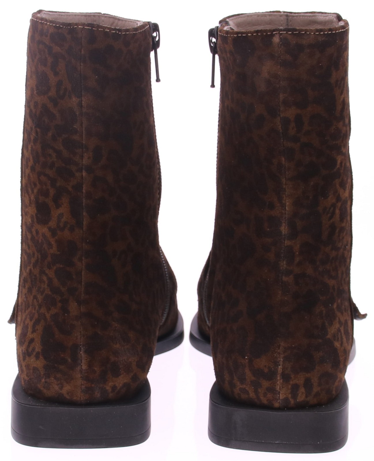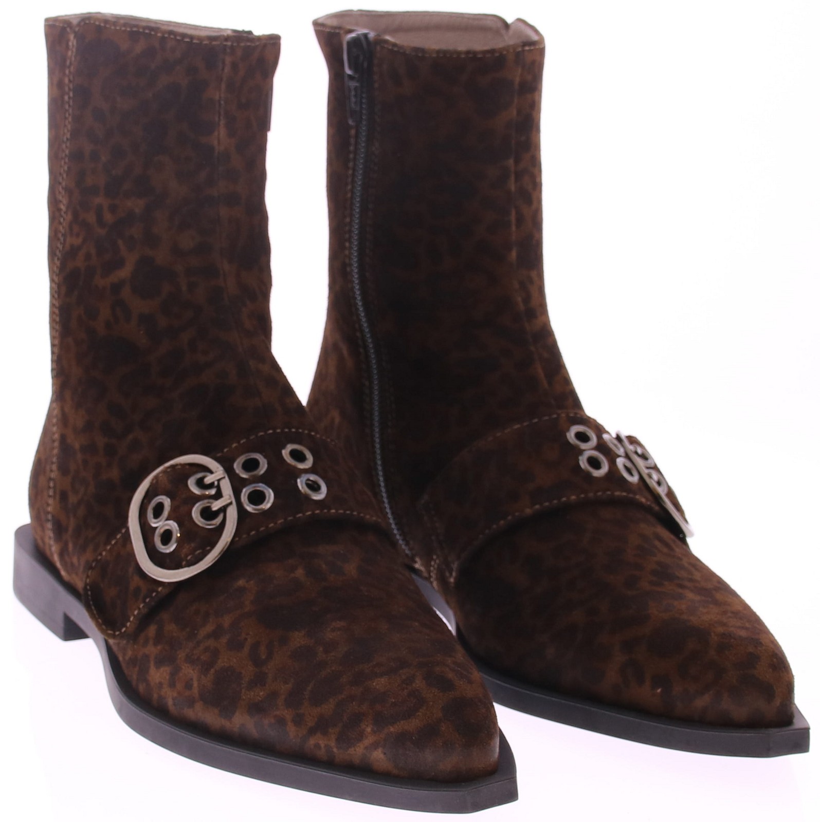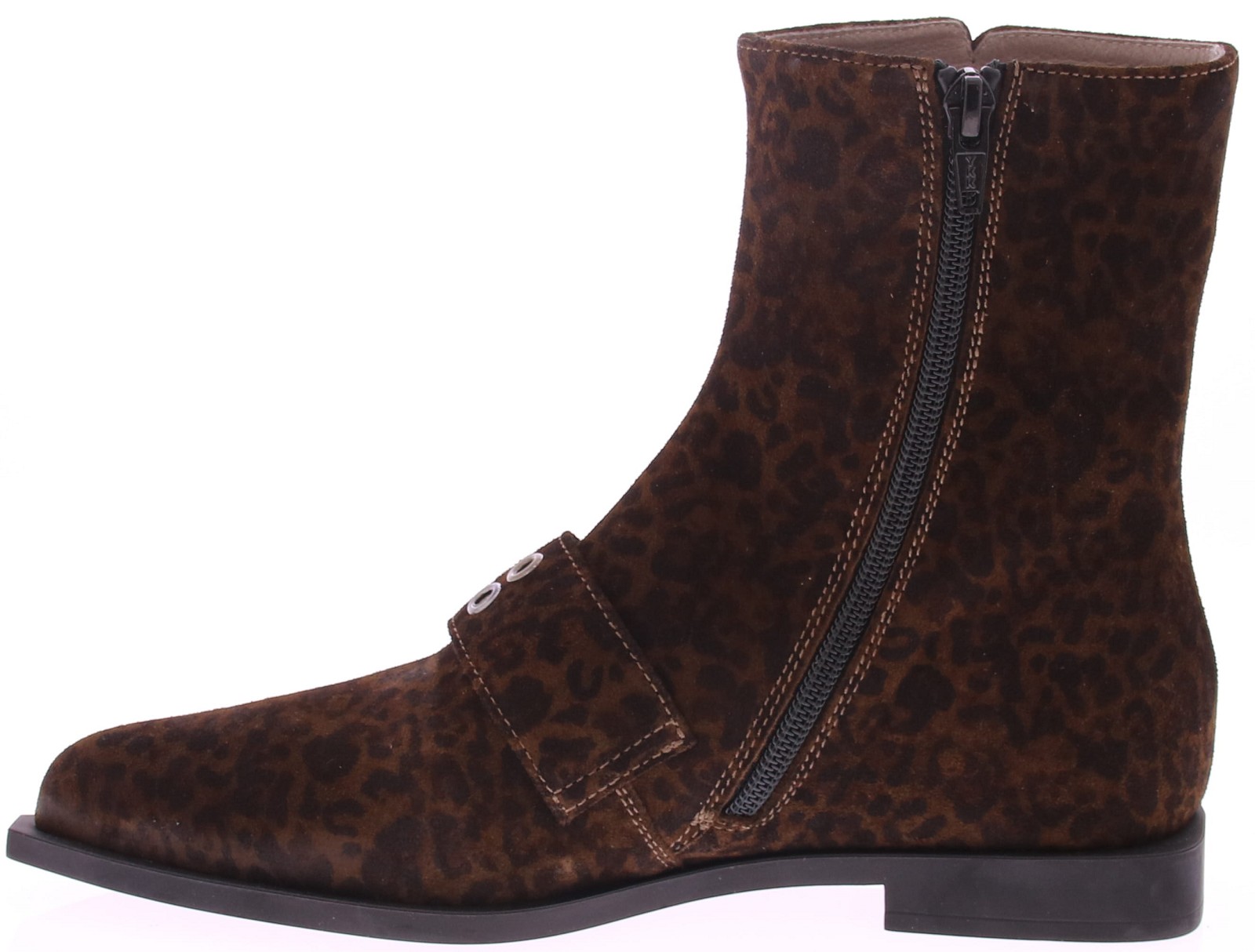 Brown suede women's ankle boots from DL Sport. Make a bold style statement with these buckle boots. The leopard print suede gives them a fashionable look, while the wide buckle detail with metal eyelets on the instep adds a bold touch. The boots have an inner zipper and a removable insole.