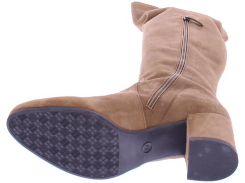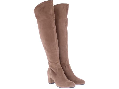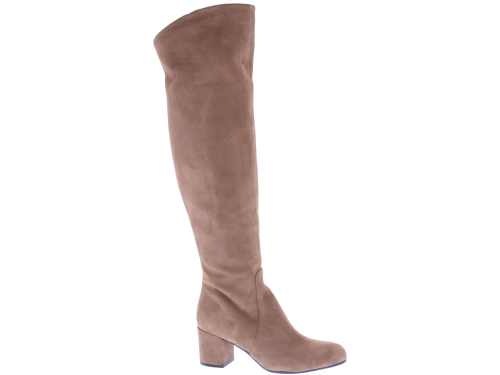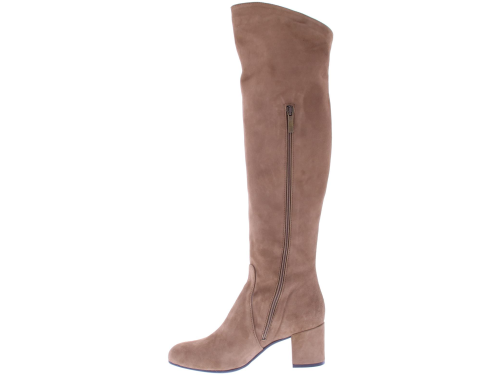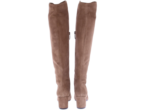 Beige suede women's long boot by Donna Lei. This boot has a beautiful rounded basic last, comes just over the knee and has a 5 cm high block heel. On the inside a three-quarter zip to make it easier to put on and take off. The sole is a combination of leather and rubber