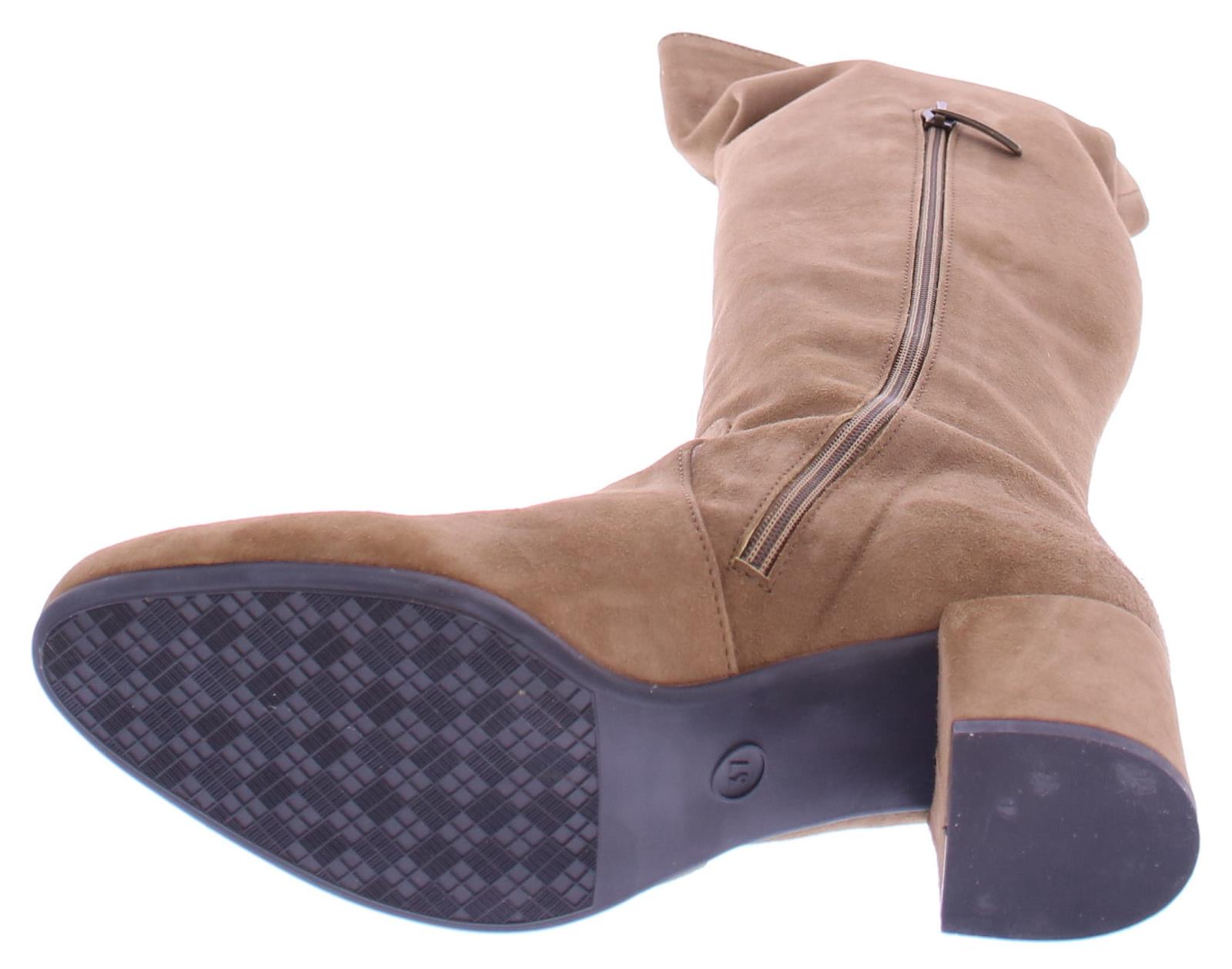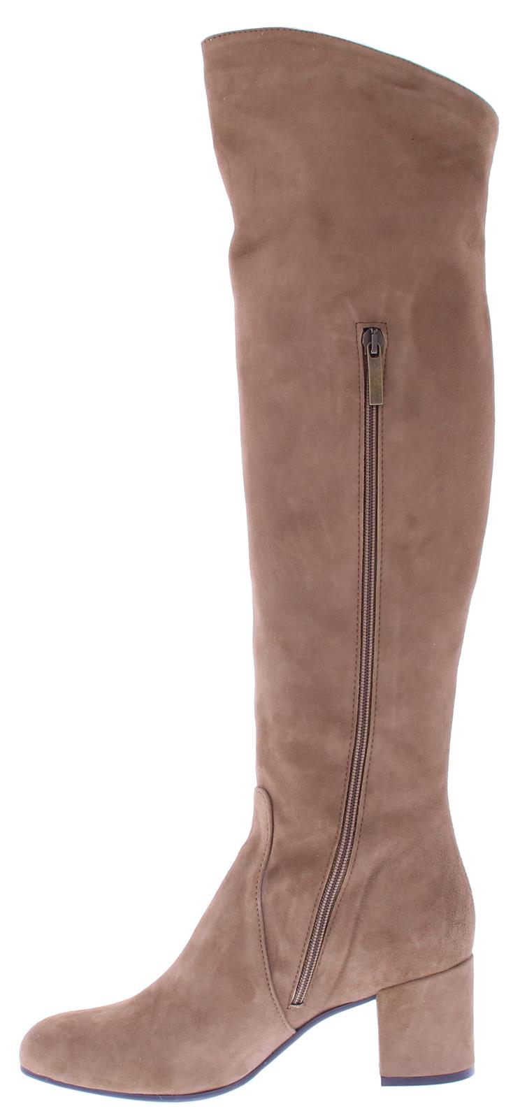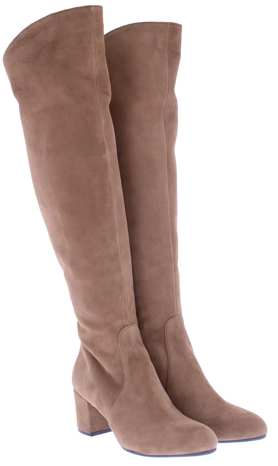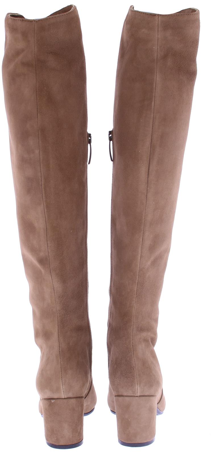 Beige suede women's long boot by Donna Lei. This boot has a beautiful rounded basic last, comes just over the knee and has a 5 cm high block heel. On the inside a three-quarter zip to make it easier to put on and take off. The sole is a combination of leather and rubber