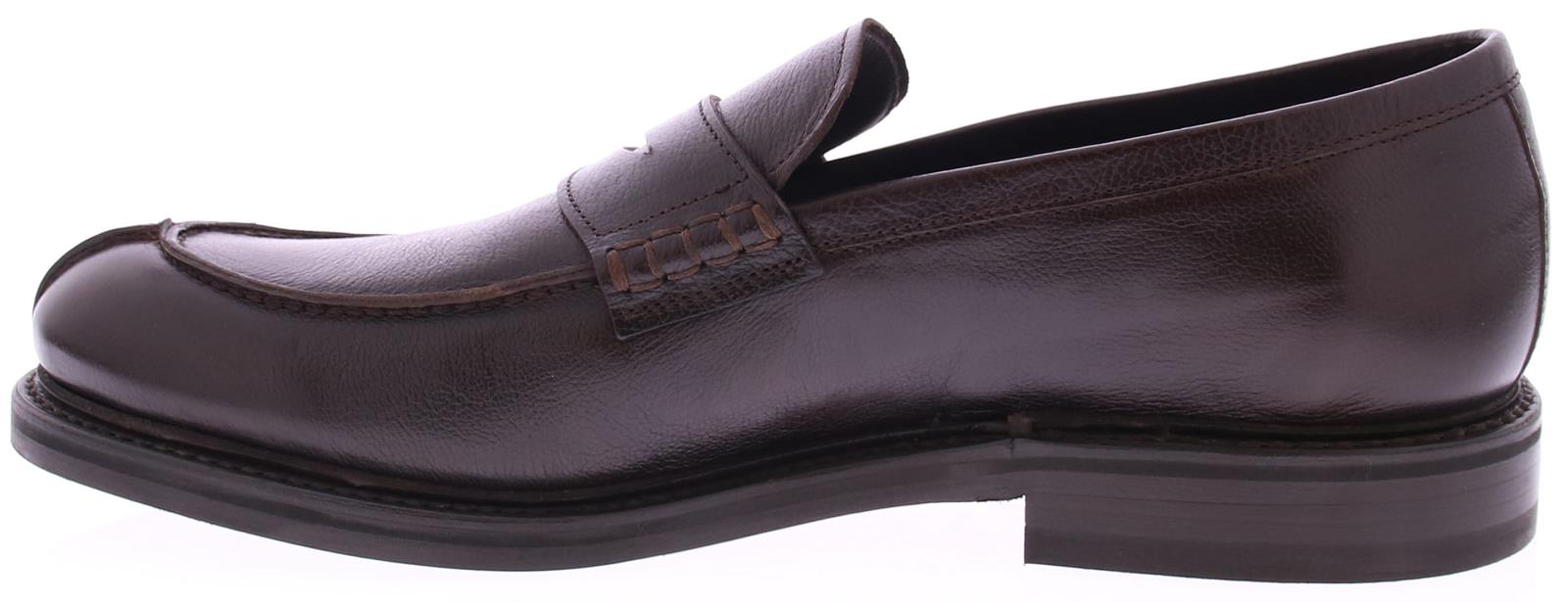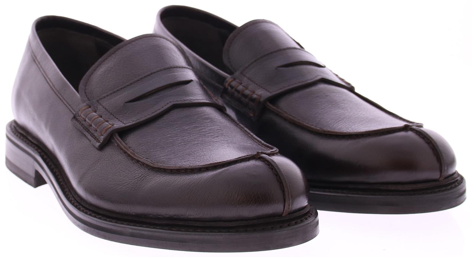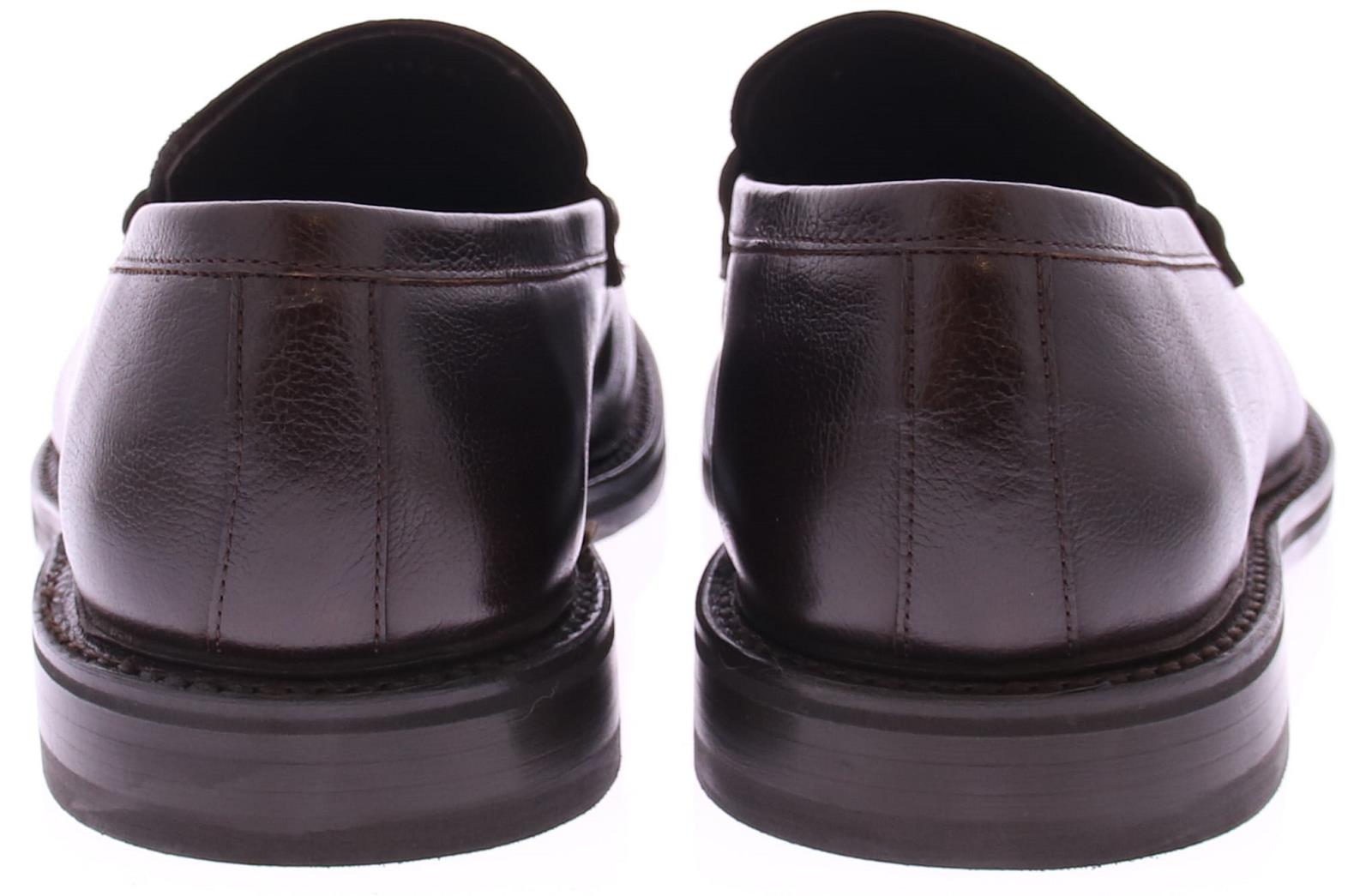 Men's loafer by Edward Allan made of very supple dark brown leather. The shoe has a leather lining and is made on a leather sole with rubber insert. The loafer is made goodyear.