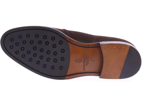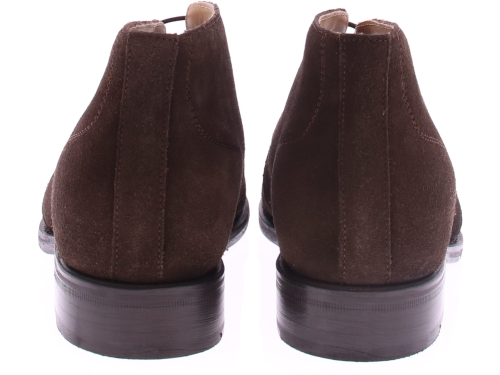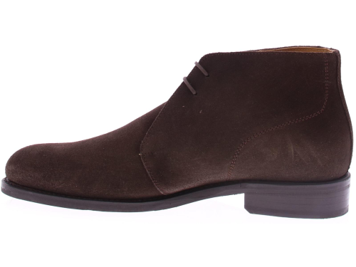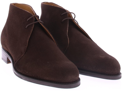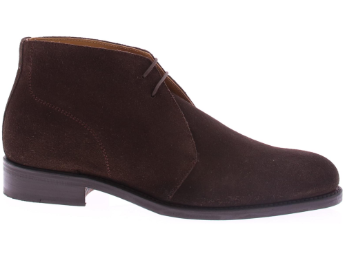 Men's lace-up boot by Edward Allan in dark brown calf suede, made on a leather sole with rubber insert. The shoe is leather lined and goodyear made.