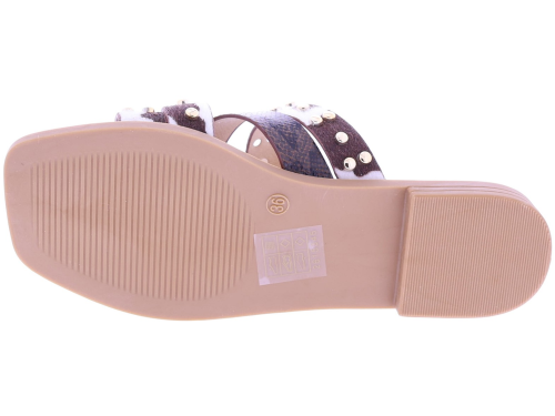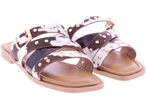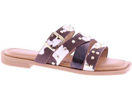 Brown women's slides from Ella Cruz, model Zare. These slides feature crossed straps across the instep, finished with gold-colored studs. The straps feature a cowhide print, while one strap features a subtle snakeskin pattern. The PU leather lining provides soft comfort, and the thunit sole provides a sleek and durable finish. A fashionable slide that's comfortable to wear on warm days.