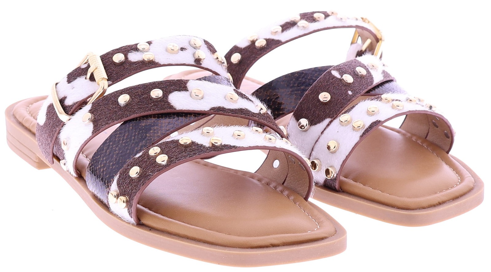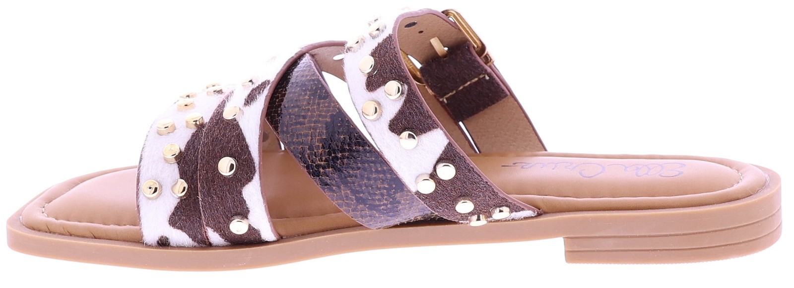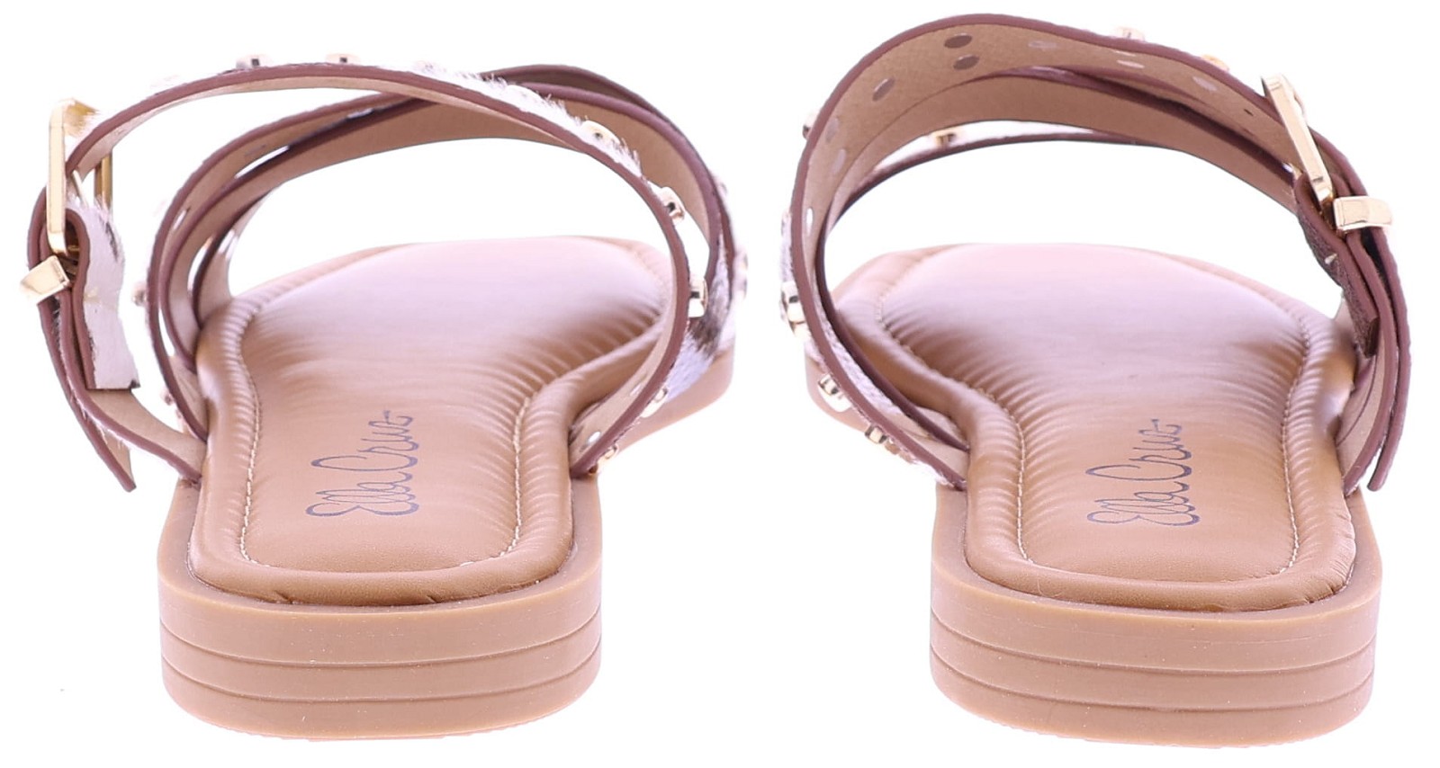 Brown women's slides from Ella Cruz, model Zare. These slides feature crossed straps across the instep, finished with gold-colored studs. The straps feature a cowhide print, while one strap features a subtle snakeskin pattern. The PU leather lining provides soft comfort, and the thunit sole provides a sleek and durable finish. A fashionable slide that's comfortable to wear on warm days.