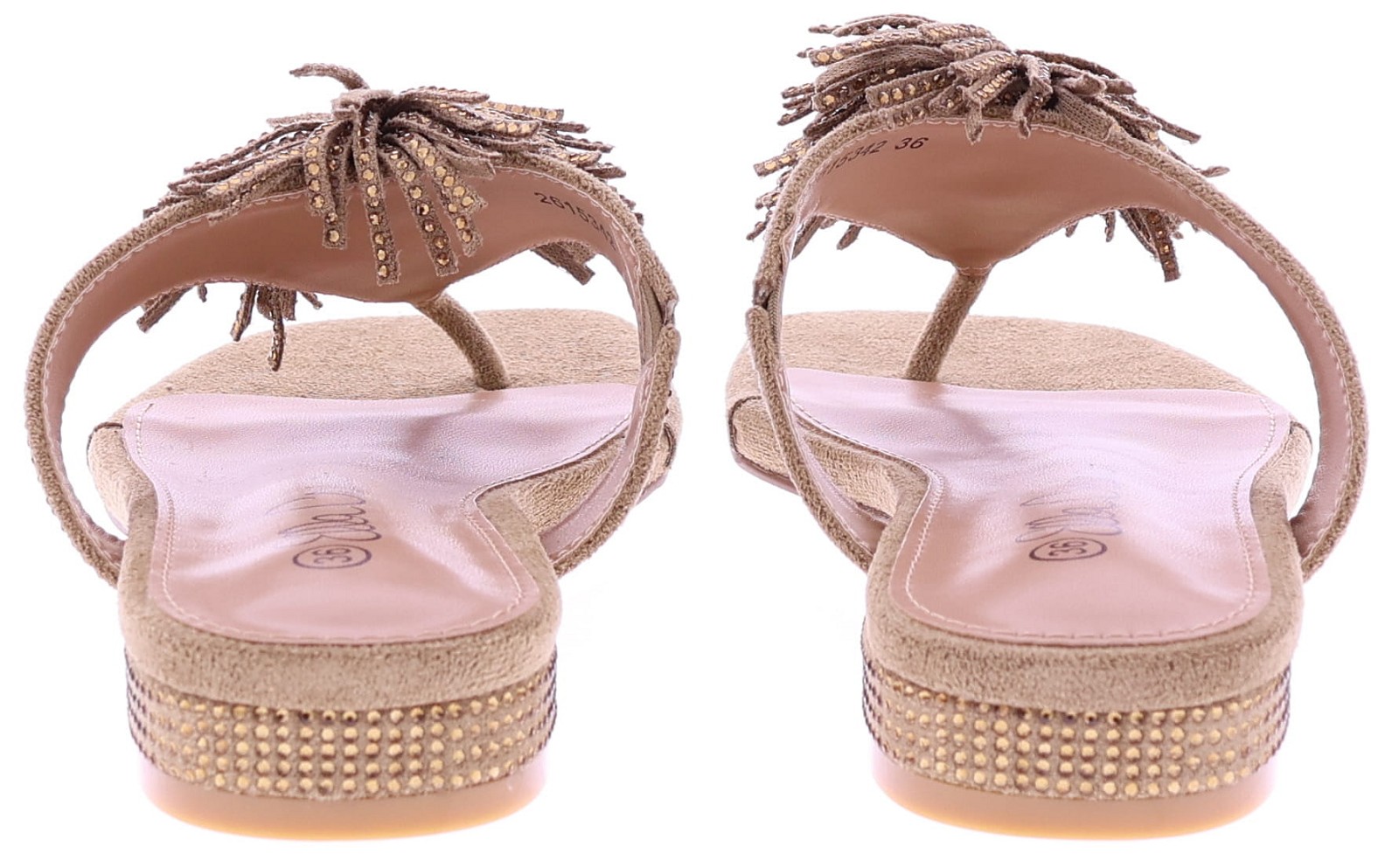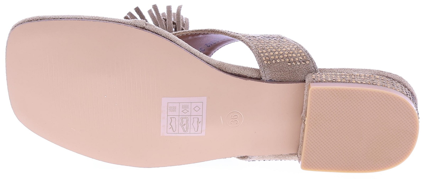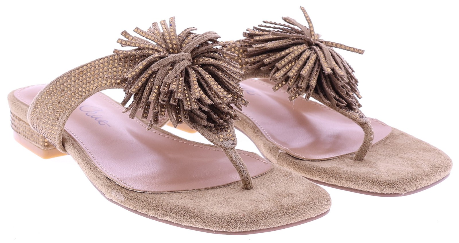 Beige suede women's slides from Ella Cruz, model Zhoe. These slides feature a wide cross-over strap, richly decorated with small rhinestones for a sparkling effect. A playful suede tassel detail on the instep adds extra character. The lining is soft for comfortable wear, and the sole has a neat finish suitable for everyday wear. A striking and airy slide for summer days.