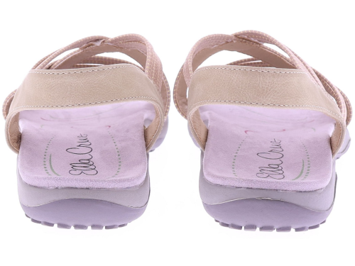 Beige women's sandals from Ella Cruz, style Zyara. These sandals have elastic straps across the instep for a flexible and secure fit. The heel strap offers extra support, and the soft, comfortable footbed makes this style ideal for everyday wear. The lightweight sole is comfortable and offers extra walking comfort. A practical and comfortable sandal for warm days.
