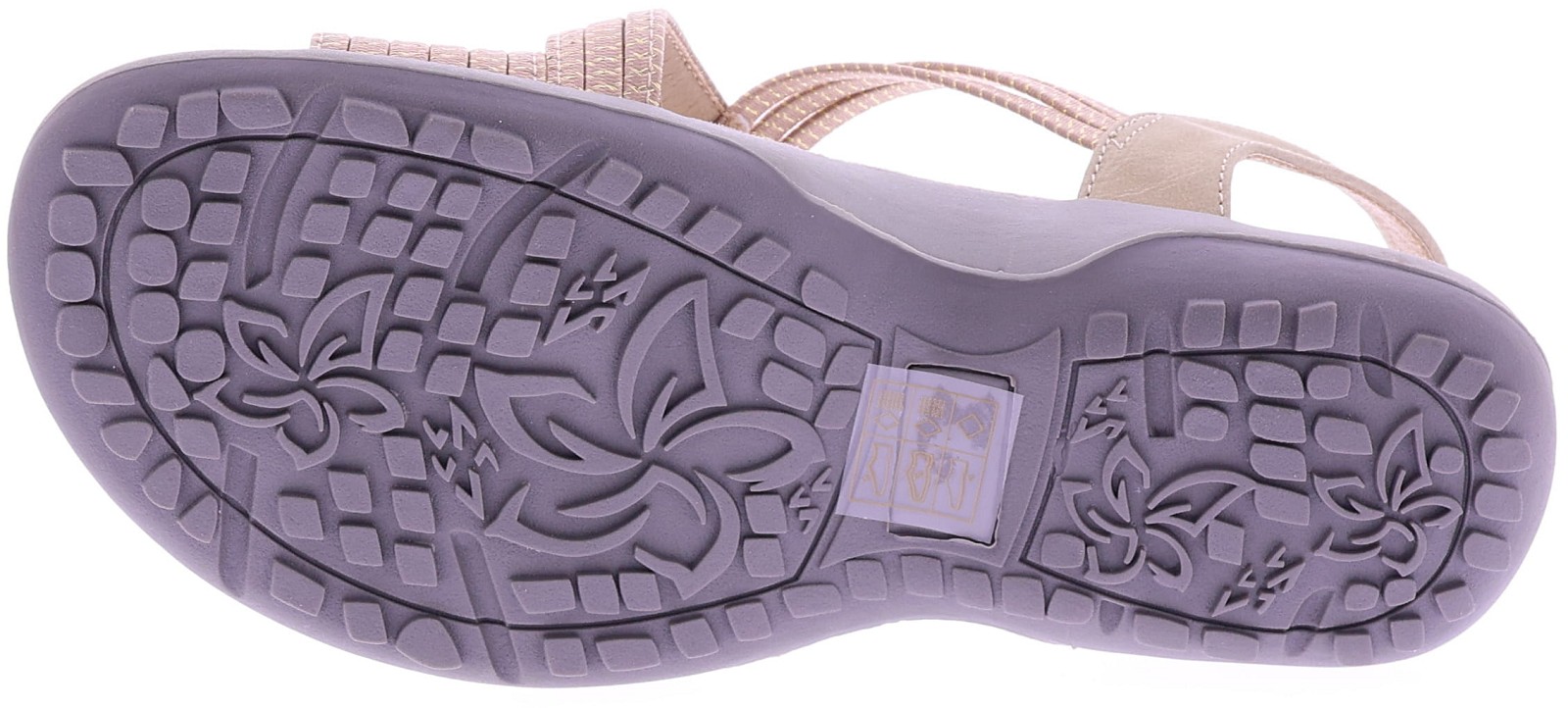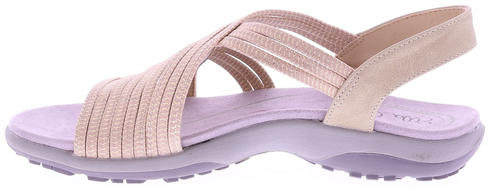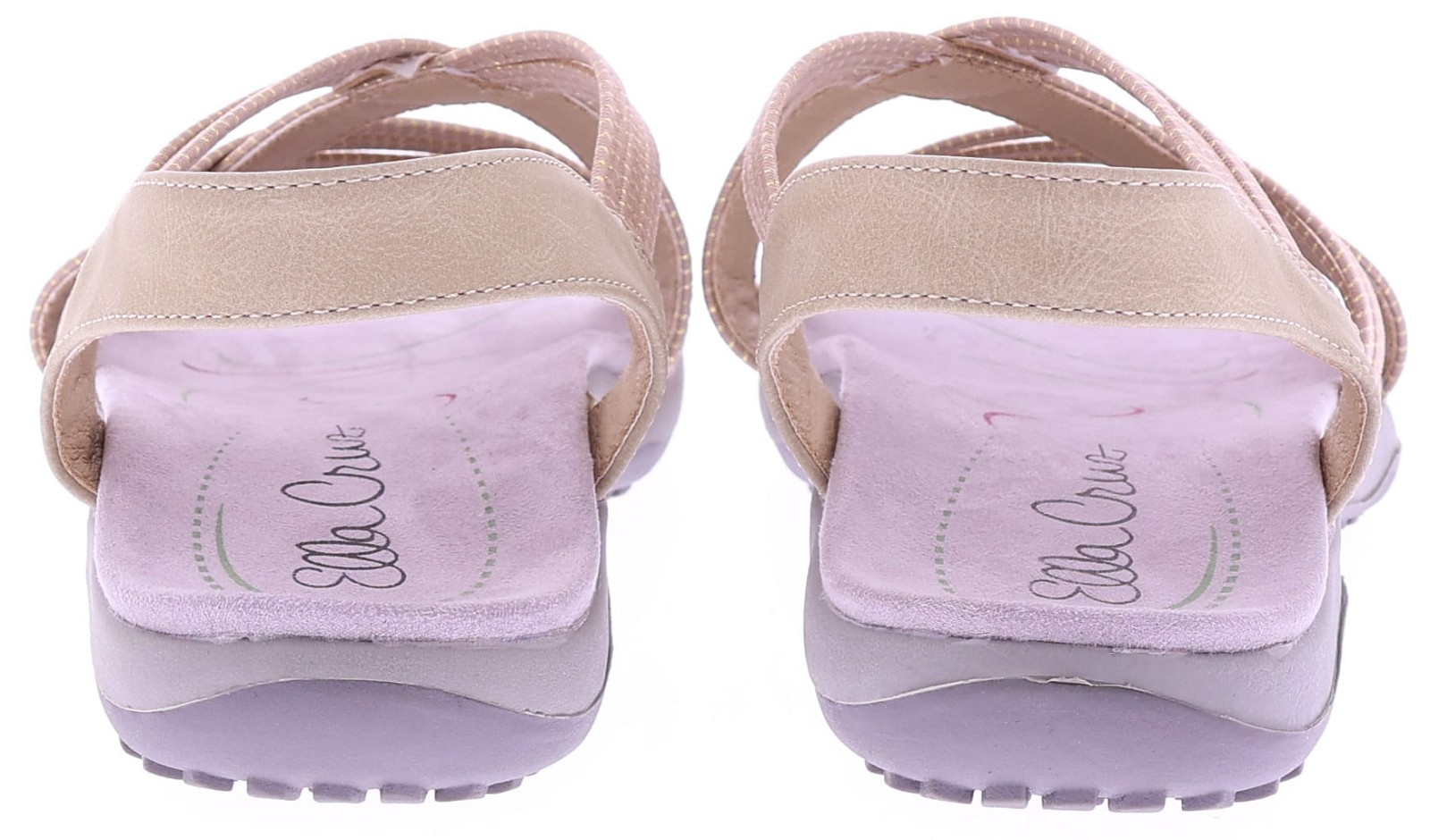 Beige women's sandals from Ella Cruz, style Zyara. These sandals have elastic straps across the instep for a flexible and secure fit. The heel strap offers extra support, and the soft, comfortable footbed makes this style ideal for everyday wear. The lightweight sole is comfortable and offers extra walking comfort. A practical and comfortable sandal for warm days.
