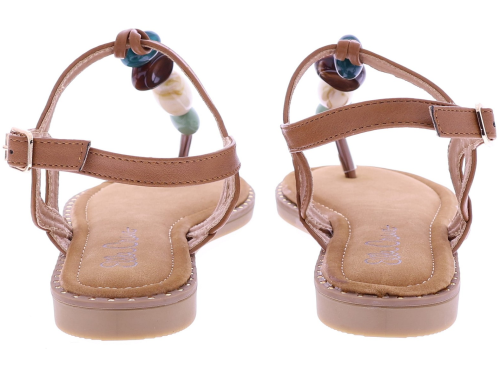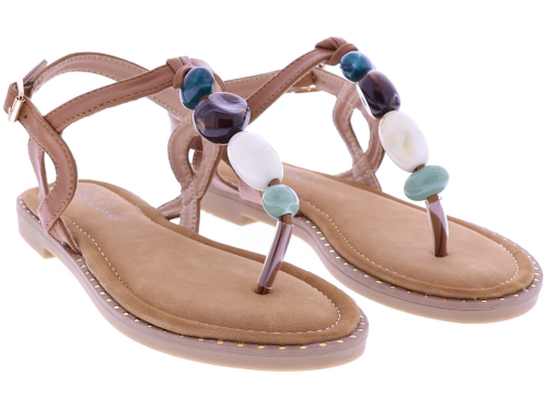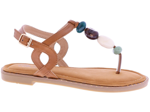 Brown women's sandals from Ella Cruz, model Zulay. This thong sandal features a strap adorned with large beads in various colors for a playful summery effect. The ankle strap is adjustable with a buckle for a secure fit. The lining is made of PU leather, and the rubber sole ensures light and comfortable walking. A light sandal with a neat finish that's perfect for warm days and casual outfits.