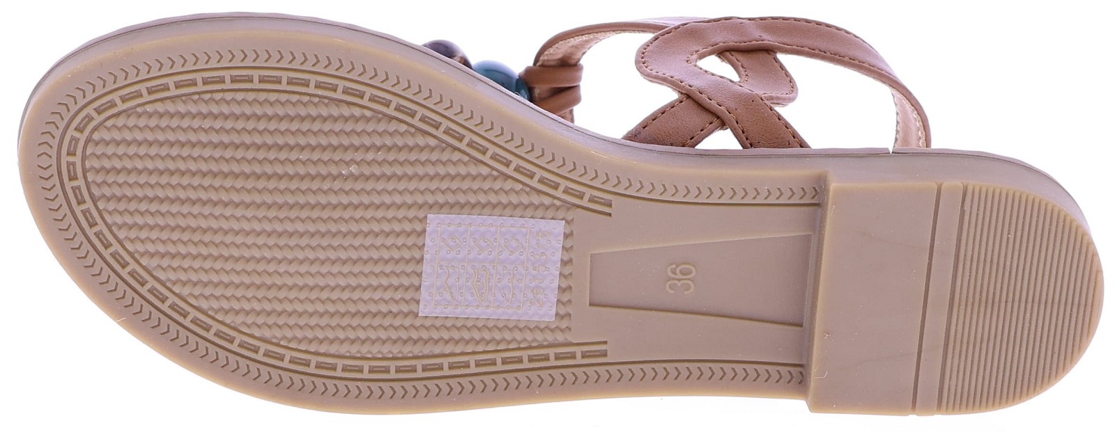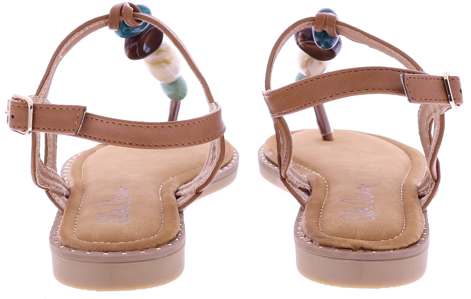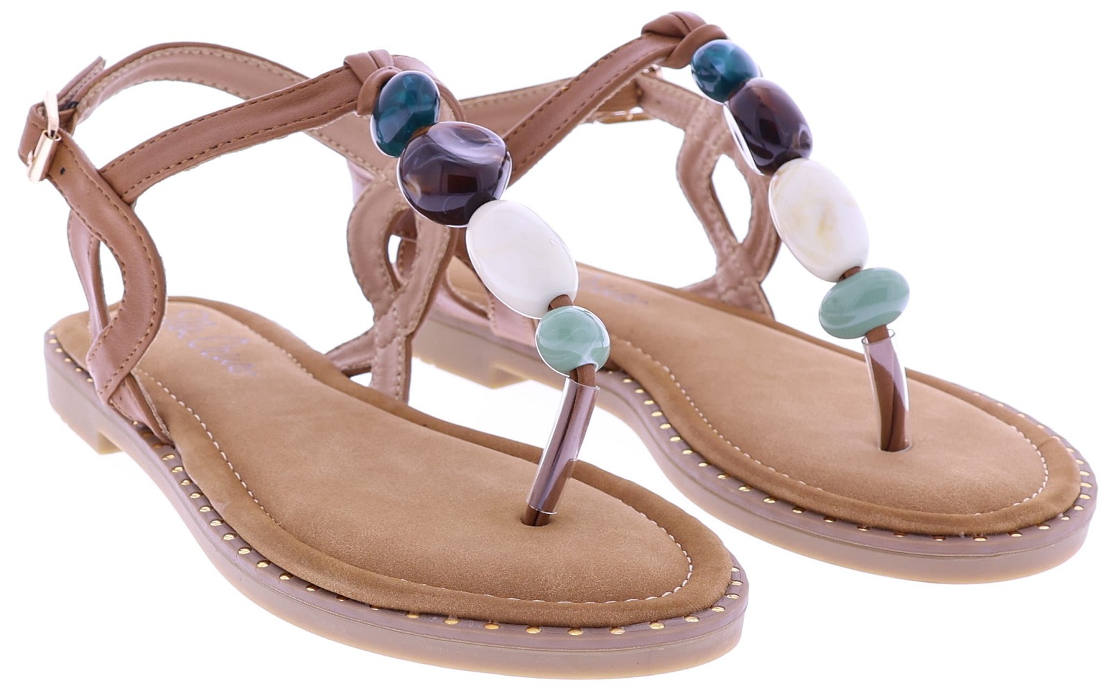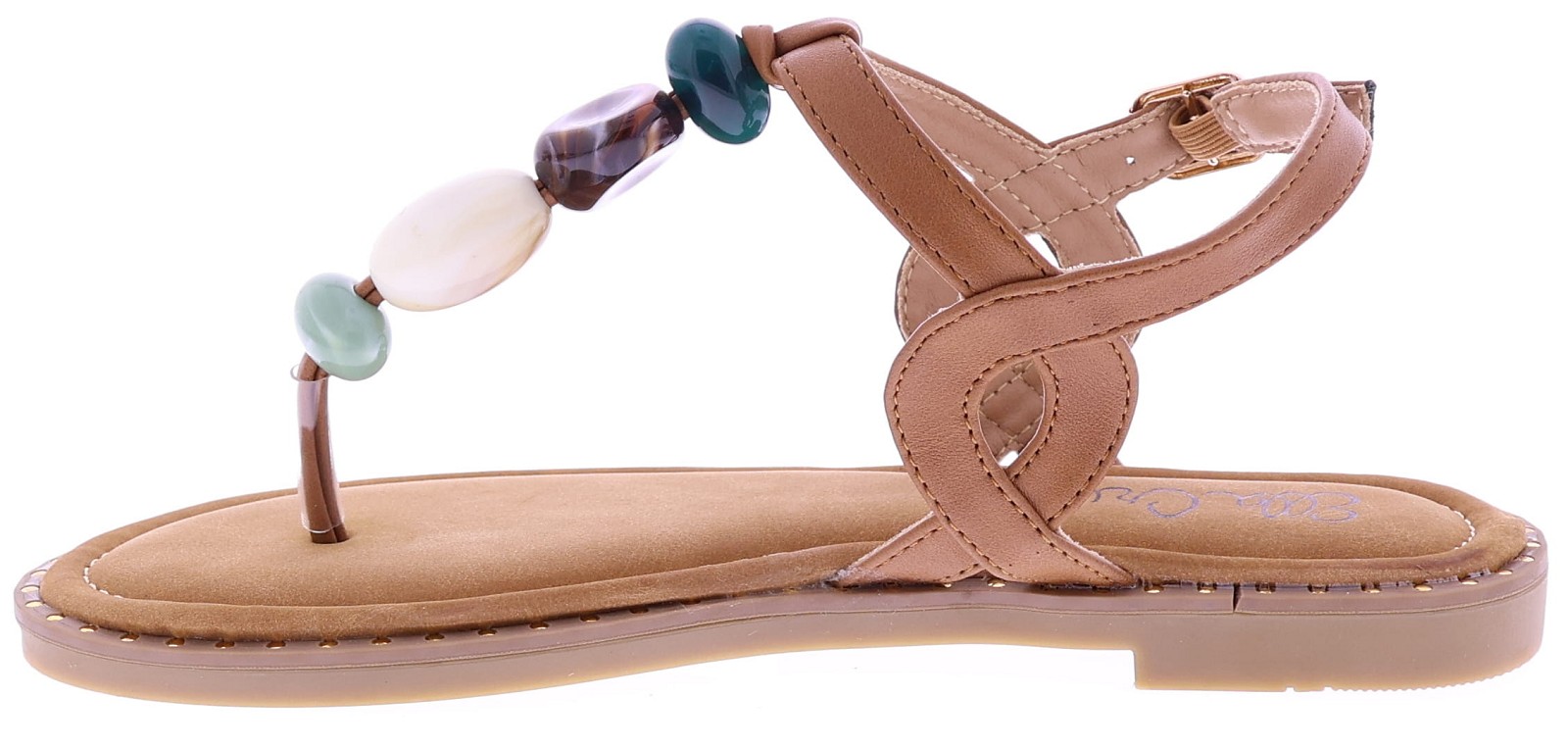 Brown women's sandals from Ella Cruz, model Zulay. This thong sandal features a strap adorned with large beads in various colors for a playful summery effect. The ankle strap is adjustable with a buckle for a secure fit. The lining is made of PU leather, and the rubber sole ensures light and comfortable walking. A light sandal with a neat finish that's perfect for warm days and casual outfits.