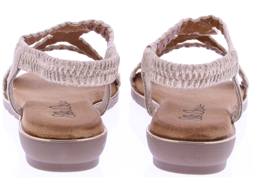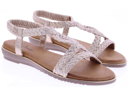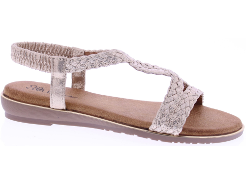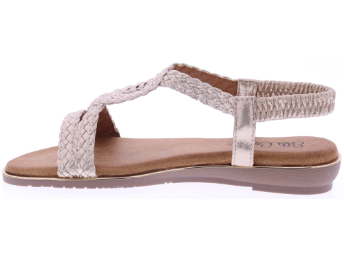 Gold-colored women's sandals from Ella Cruz, style Rhune. These sandals feature braided rope straps with a shimmering finish across the instep. The heel strap is elastic, making the sandals easy to slip on and snug around the foot. The footbed is softly finished for comfort, and the lightweight sole is smooth to walk on. A summery and versatile style that pairs beautifully with both airy trousers and a dress. Discover other women's sandals from Ella Cruz at Klijsen.